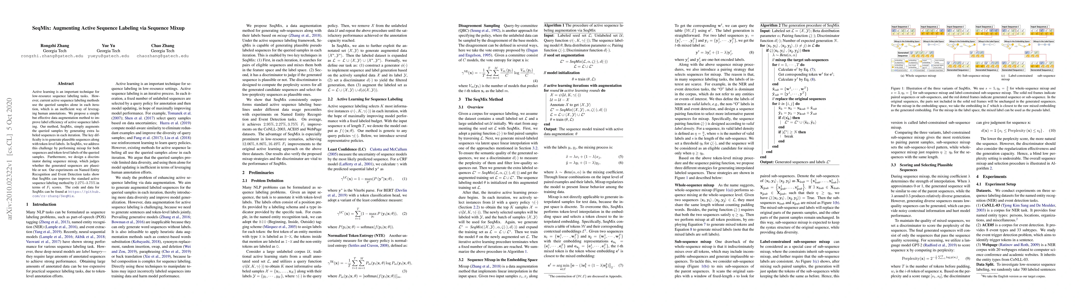 SeqMix introduces a simple yet effective data augmentation method for active sequence labeling, which performs mixup in both sequence and token-level label spaces, thereby generating plausible sequences for human annotation and improving label efficiency.