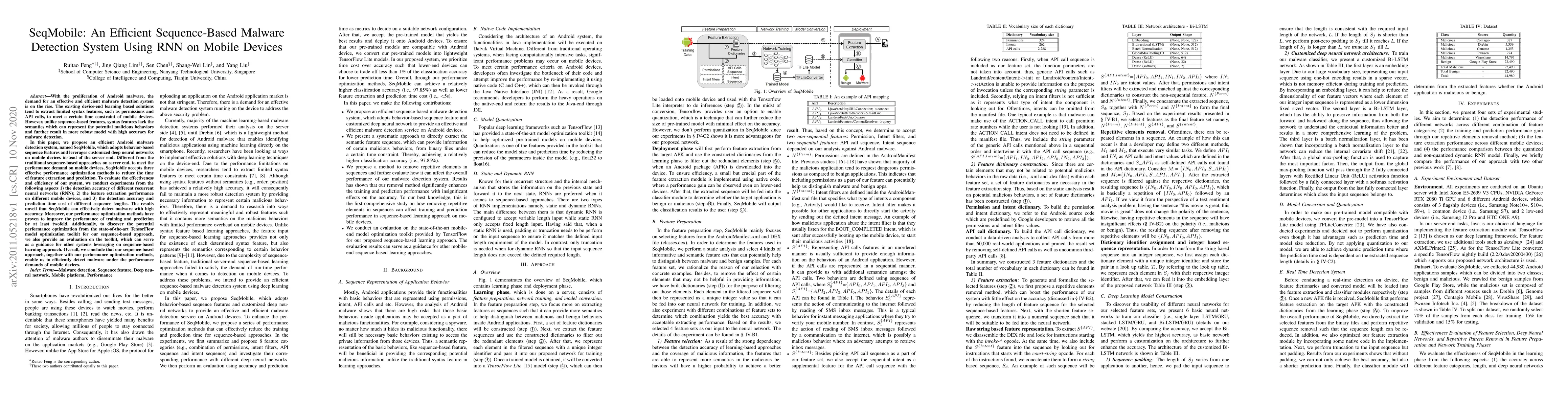 SeqMobile proposes an efficient Android malware detection system using behavior-based sequence features and customized deep neural networks on mobile devices. Performance optimization methods enhance training and prediction efficiency, achieving high detection accuracy.