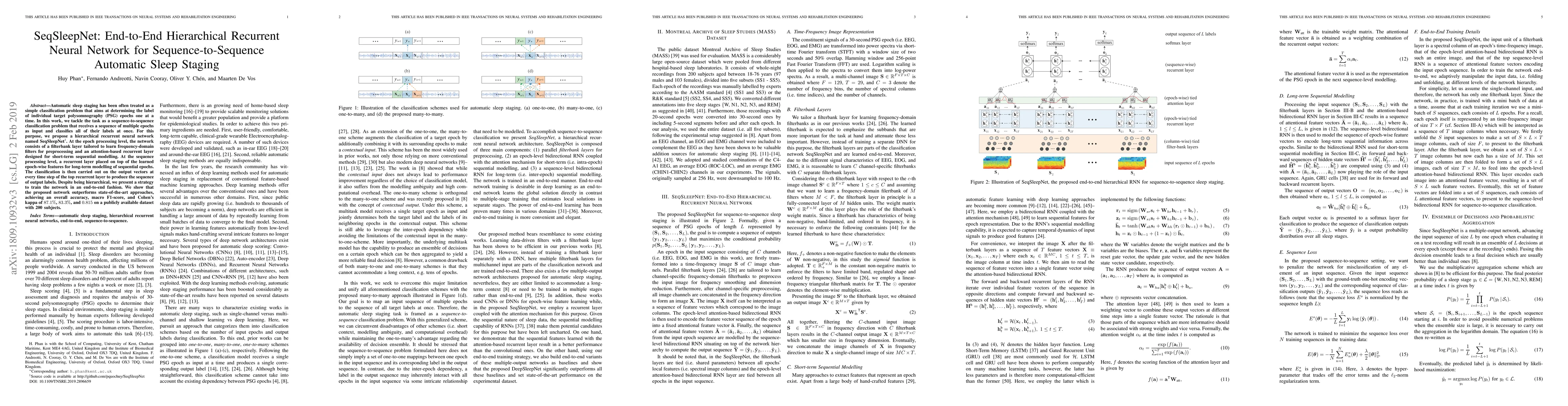 SeqSleepNet proposes a hierarchical recurrent neural network for end-to-end sequence-to-sequence automatic sleep staging, outperforming existing methods with 87.1% accuracy, 83.3% macro F1-score, and a Cohen's kappa of 0.815. It employs a filterbank and attention-based layers for epoch processing, followed by a recurrent layer for sequence-level modeling.