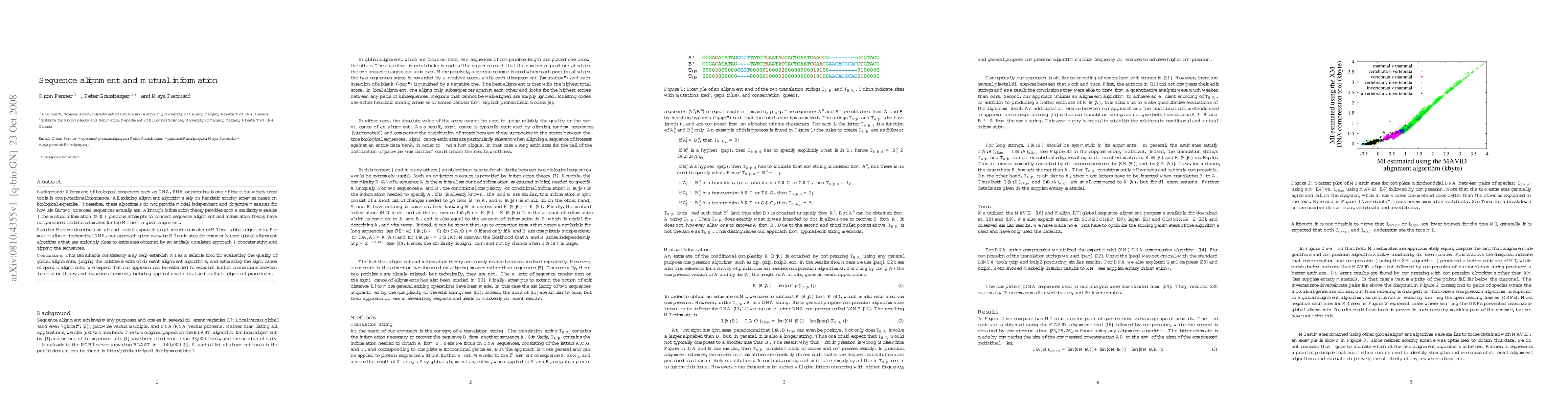 Background: Alignment of biological sequences such as DNA, RNA or proteins is one of the most widely used tools in computational bioscience. All existing alignment algorithms rely on heuristic scoring schemes based on biological expertise. Therefore, these algorithms do not provide model independent and objective measures for how similar two (or more) sequences actually are. Although information theory provides such a similarity measure -- the mutual information (MI) -- previous attempts to connect sequence alignment and information theory have not produced realistic estimates for the MI from a given alignment. Results: Here we describe a simple and flexible approach to get robust estimates of MI from {\it global} alignments. For mammalian mitochondrial DNA, our approach gives pairwise MI estimates for commonly used global alignment algorithms that are strikingly close to estimates obtained by an entirely unrelated approach -- concatenating and zipping the sequences. Conclusions: This remarkable consistency may help establish MI as a reliable tool for evaluating the quality of global alignments, judging the relative merits of different alignment algorithms, and estimating the significance of specific alignments. We expect that our approach can be extended to establish further connections between information theory and sequence alignment, including applications to local and multiple alignment procedures.
