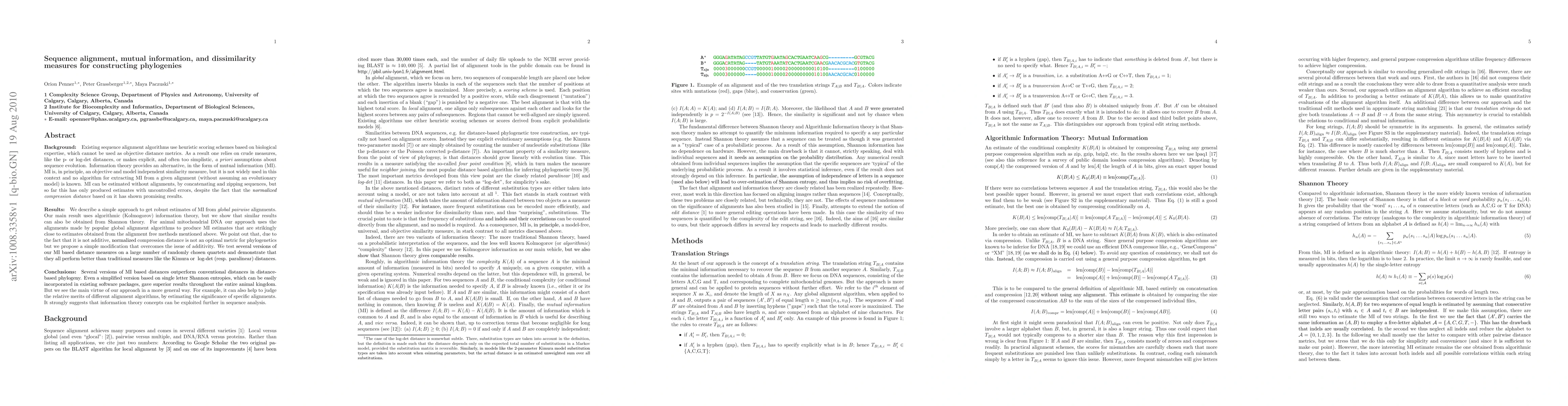This paper proposes using mutual information (MI) derived from sequence alignments to construct phylogenies, offering a robust alternative to traditional heuristic methods. The authors demonstrate that their MI-based distance measures outperform conventional metrics, and they suggest a modification to address the non-additivity issue of the normalized compression distance.
