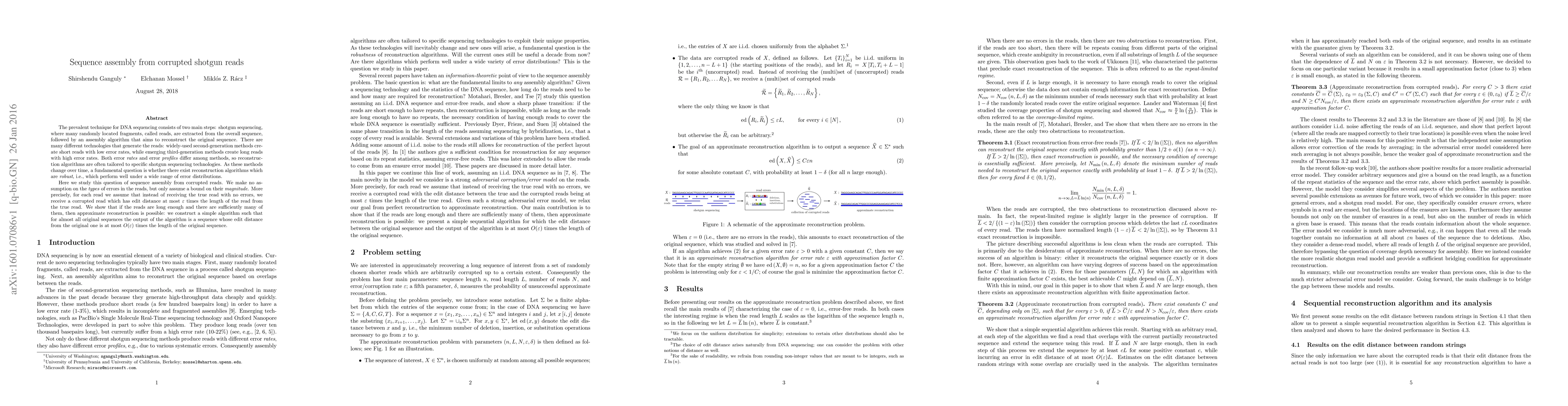 This paper investigates the robustness of sequence assembly algorithms for DNA sequencing, focusing on the ability to reconstruct the original sequence from corrupted shotgun reads with unknown error types and profiles. The authors propose a simple algorithm that can achieve approximate reconstruction if the reads are sufficiently long and numerous, ensuring the edit distance from the original sequence is proportional to the error bound.