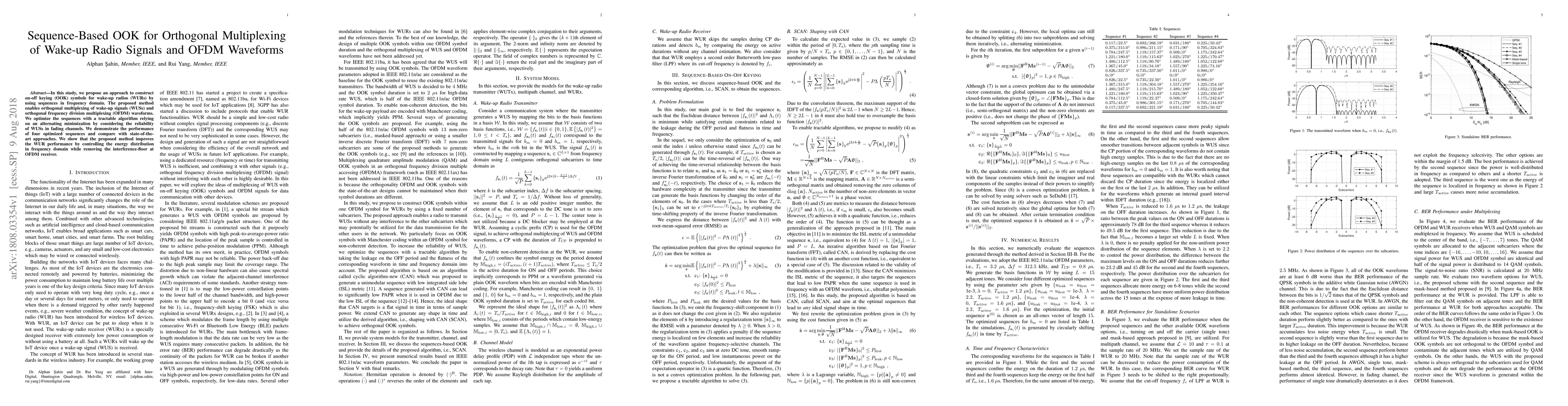 This paper proposes a sequence-based on-off keying (OOK) method for orthogonal multiplexing of wake-up radio signals and OFDM waveforms, optimizing sequences using an alternating minimization technique to enhance WUR performance in fading channels. The approach demonstrates improved receiver performance by managing energy distribution and reducing interference.