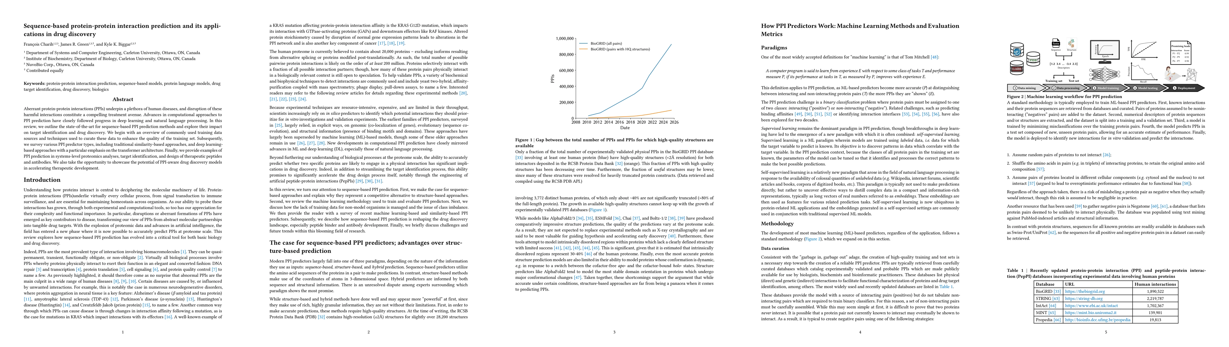 Aberrant protein-protein interactions (PPIs) underpin a plethora of human diseases, and disruption of these harmful interactions constitute a compelling treatment avenue. Advances in computational approaches to PPI prediction have closely followed progress in deep learning and natural language processing. In this review, we outline the state-of the-art for sequence-based PPI prediction methods and explore their impact on target identification and drug discovery. We begin with an overview of commonly used training data sources and techniques used to curate these data to enhance the quality of the training set. Subsequently, we survey various PPI predictor types, including traditional similarity-based approaches, and deep learning-based approaches with a particular emphasis on the transformer architecture. Finally, we provide examples of PPI prediction in systems-level proteomics analyses, target identification, and design of therapeutic peptides and antibodies. We also take the opportunity to showcase the potential of PPI-aware drug discovery models in accelerating therapeutic development.