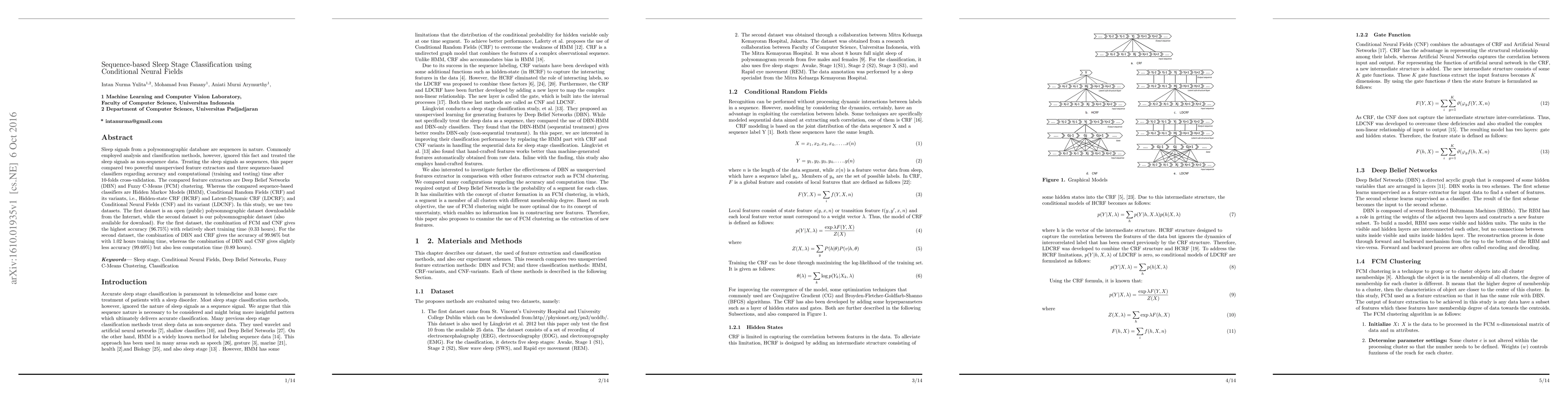 This paper evaluates sequence-based methods for sleep stage classification using polysomnographic data, comparing Deep Belief Networks and Fuzzy C-Means for feature extraction and Hidden Markov Models, Conditional Random Fields, and Conditional Neural Fields for classification. The best combination for the public dataset was FCM and CNF, achieving 96.75% accuracy, while DBN and CRF performed best on the proprietary dataset with 99.96% accuracy but longer training time.