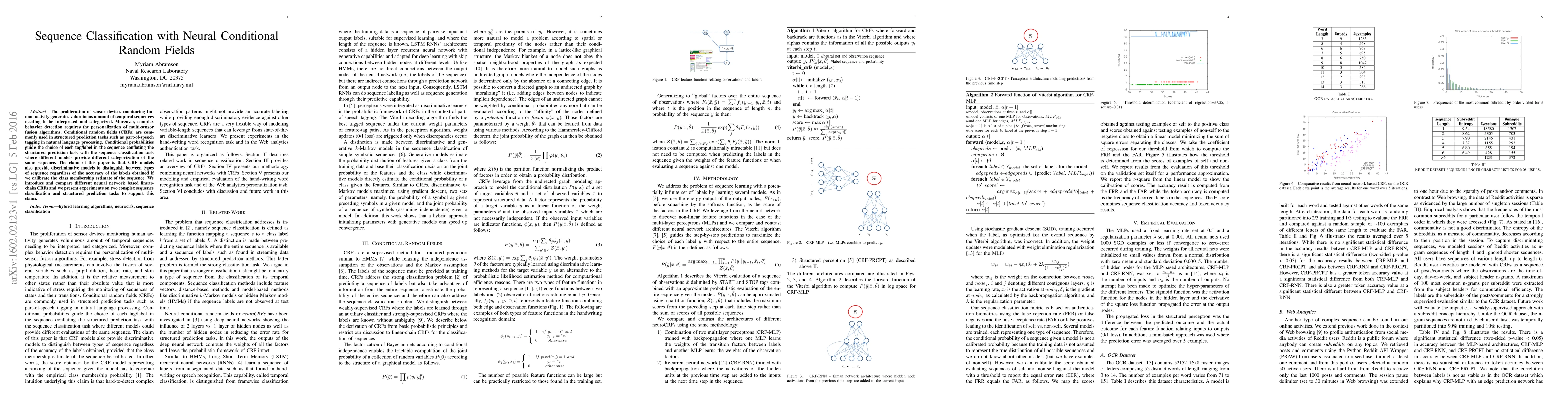 The proliferation of sensor devices monitoring human activity generates voluminous amount of temporal sequences needing to be interpreted and categorized. Moreover, complex behavior detection requires the personalization of multi-sensor fusion algorithms. Conditional random fields (CRFs) are commonly used in structured prediction tasks such as part-of-speech tagging in natural language processing. Conditional probabilities guide the choice of each tag/label in the sequence conflating the structured prediction task with the sequence classification task where different models provide different categorization of the same sequence. The claim of this paper is that CRF models also provide discriminative models to distinguish between types of sequence regardless of the accuracy of the labels obtained if we calibrate the class membership estimate of the sequence. We introduce and compare different neural network based linear-chain CRFs and we present experiments on two complex sequence classification and structured prediction tasks to support this claim.