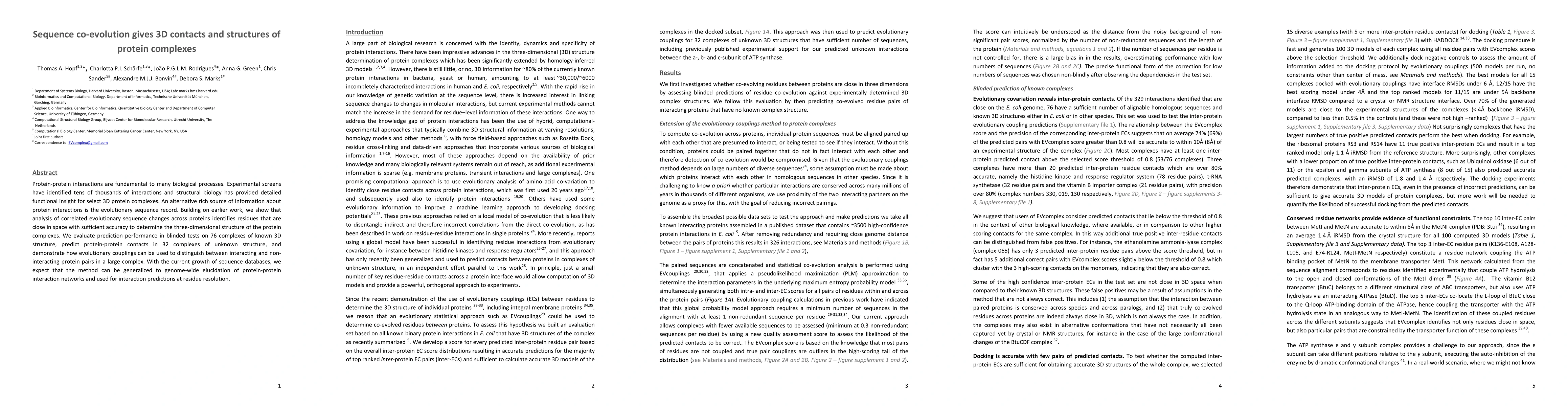 This paper demonstrates that analyzing correlated evolutionary sequence changes across proteins can accurately predict 3D contacts and structures of protein complexes. The method was validated on 76 complexes with known structures and used to predict contacts in 32 unknown structures, showing potential for genome-wide interaction network elucidation.