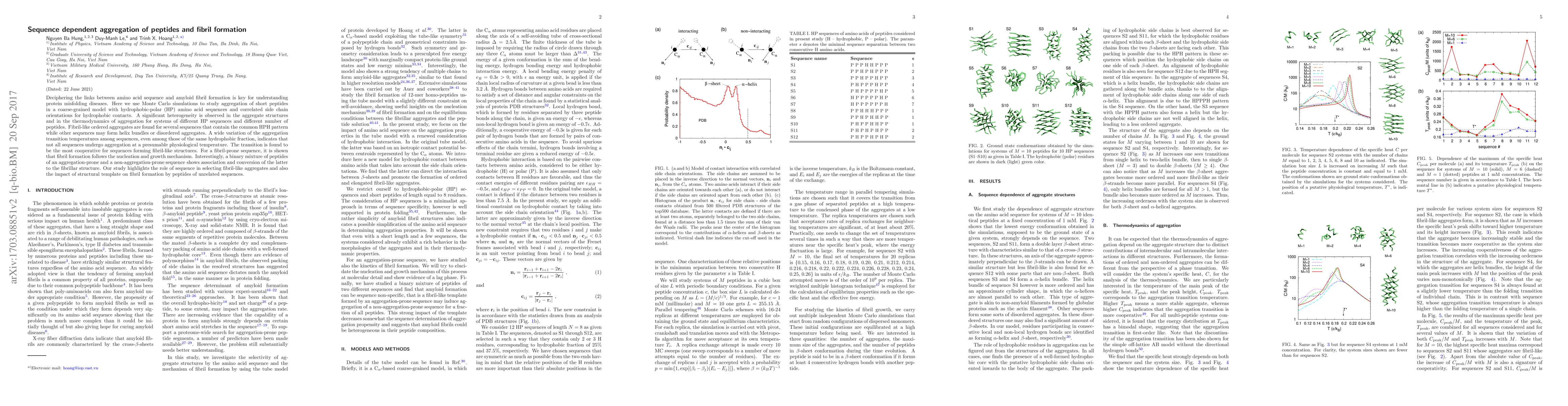 Researchers used Monte Carlo simulations to study how different amino acid sequences affect protein aggregation, finding that some sequences form fibril-like structures while others create helix bundles or disordered aggregates.