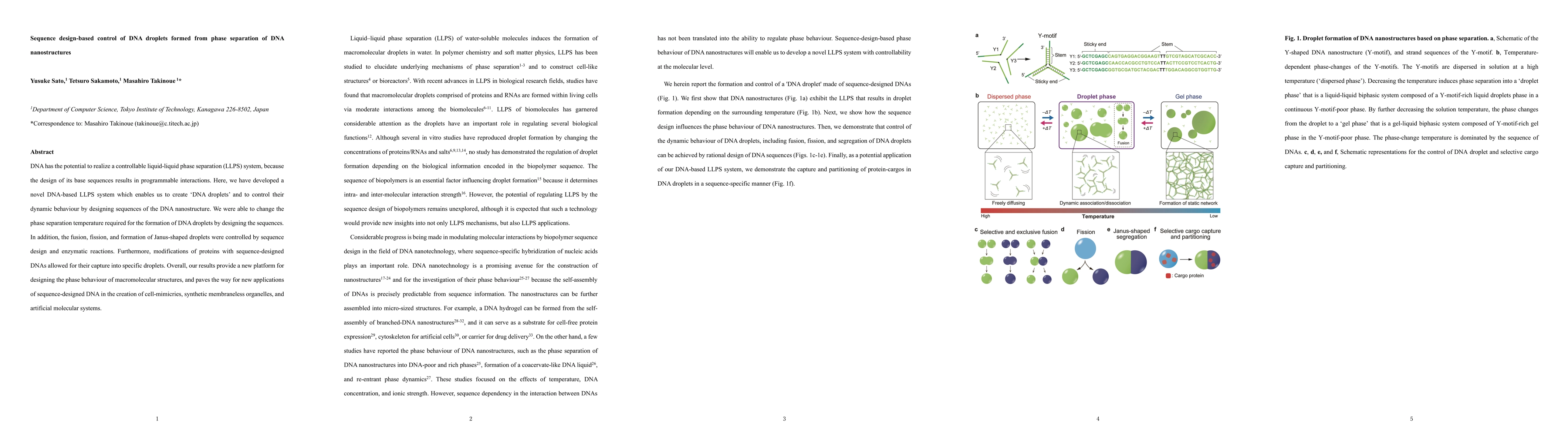 This paper develops a DNA-based liquid-liquid phase separation system to create and control "DNA droplets" through sequence design, enabling dynamic behavior such as fusion, fission, and Janus-shaped formation. The study opens new avenues for sequence-designed DNA in synthetic biology and artificial molecular systems.