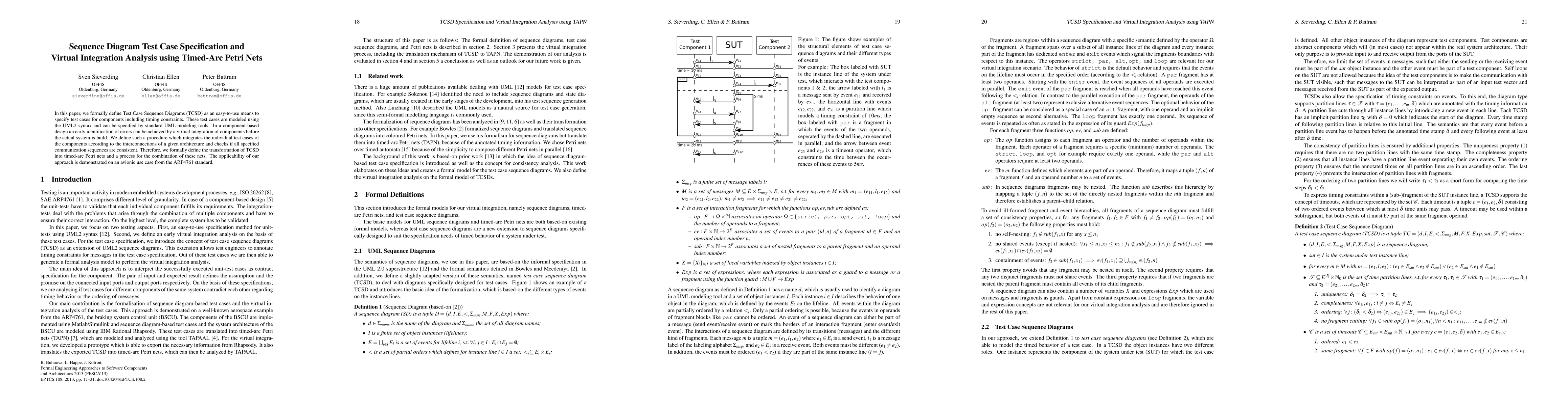 This paper introduces Test Case Sequence Diagrams (TCSD) to specify test cases for components with timing constraints, modeled using UML2 syntax. It proposes a method for virtual integration of components using timed-arc Petri nets to ensure consistency of communication sequences before actual system construction, demonstrated through an avionic use case.