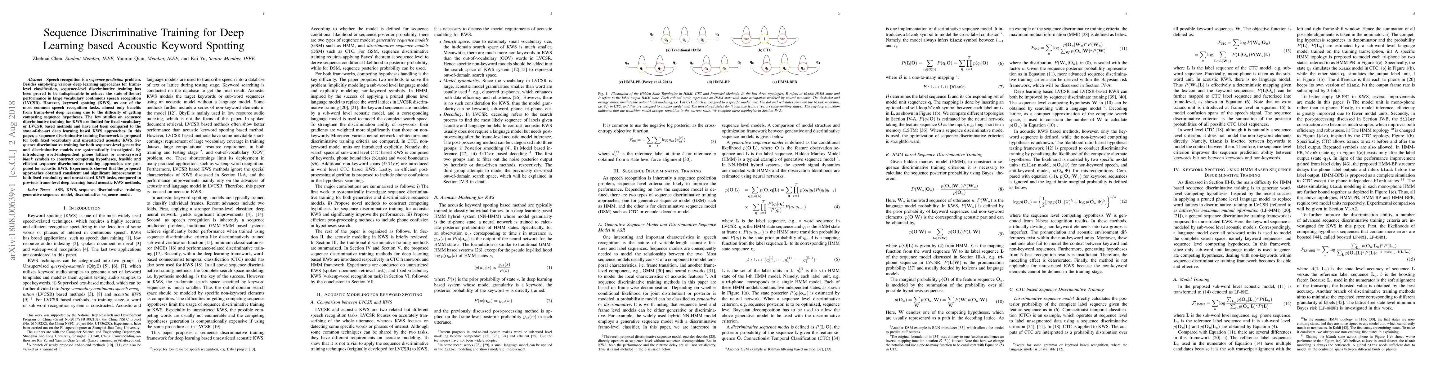 This paper proposes a sequence discriminative training framework for deep learning-based acoustic keyword spotting (KWS), improving performance over previous frame-level methods. The approach introduces competing hypotheses using word-independent phone lattices or non-keyword blank symbols, achieving consistent and significant improvements in both fixed vocabulary and unrestricted KWS tasks.
