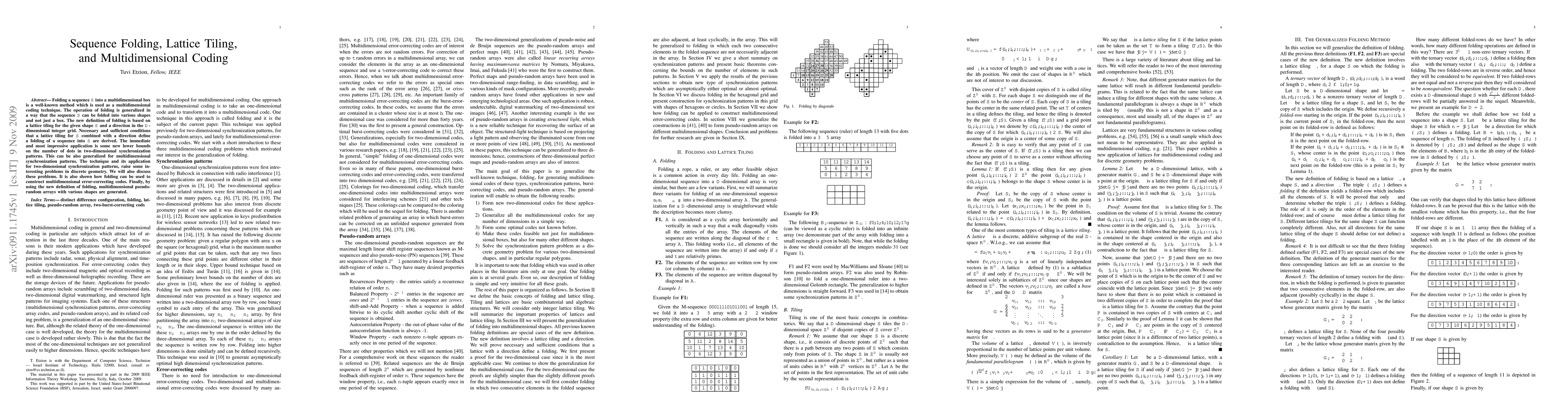 Folding a sequence $S$ into a multidimensional box is a well-known method which is used as a multidimensional coding technique. The operation of folding is generalized in a way that the sequence $S$ can be folded into various shapes and not just a box. The new definition of folding is based on a lattice tiling for the given shape $\cS$ and a direction in the $D$-dimensional integer grid. Necessary and sufficient conditions that a lattice tiling for $\cS$ combined with a direction define a folding of a sequence into $\cS$ are derived. The immediate and most impressive application is some new lower bounds on the number of dots in two-dimensional synchronization patterns. This can be also generalized for multidimensional synchronization patterns. The technique and its application for two-dimensional synchronization patterns, raise some interesting problems in discrete geometry. We will also discuss these problems. It is also shown how folding can be used to construct multidimensional error-correcting codes. Finally, by using the new definition of folding, multidimensional pseudo-random arrays with various shapes are generated.