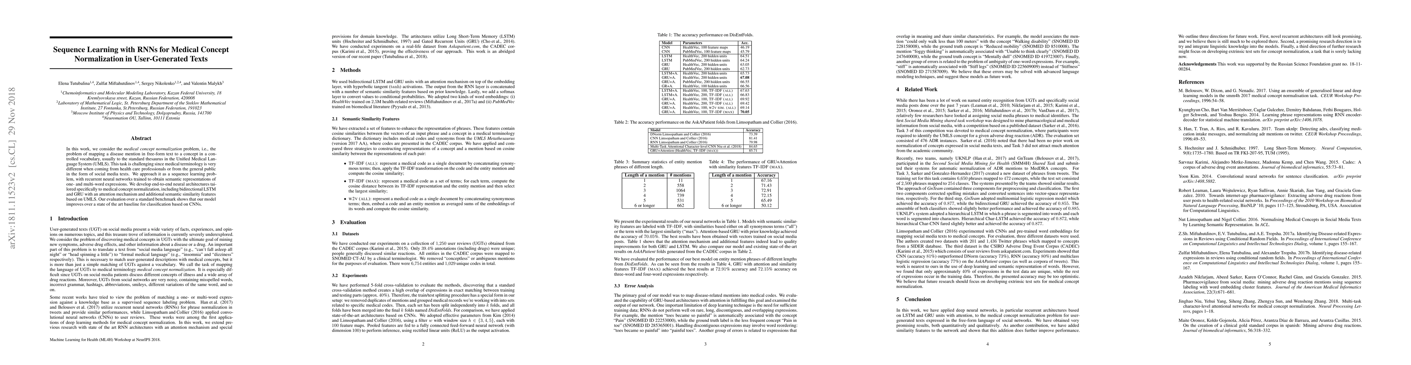 This research develops recurrent neural networks (RNNs) for normalizing medical concepts in user-generated texts by mapping disease mentions to UMLS concepts. The proposed neural architectures, including bidirectional LSTM and GRU with attention, outperform state-of-the-art CNN-based baselines on a standard benchmark.