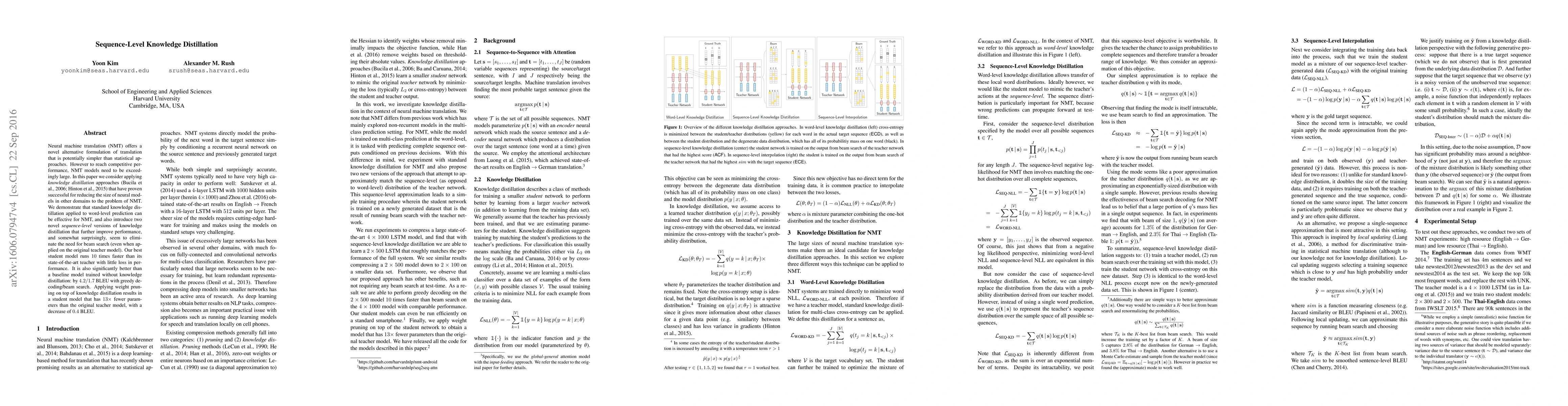 This paper explores knowledge distillation techniques to reduce the size and improve the efficiency of neural machine translation (NMT) models while maintaining competitive performance. It introduces sequence-level knowledge distillation methods that outperform standard word-level approaches and eliminate the need for beam search, achieving a 10x speedup with minimal performance loss.