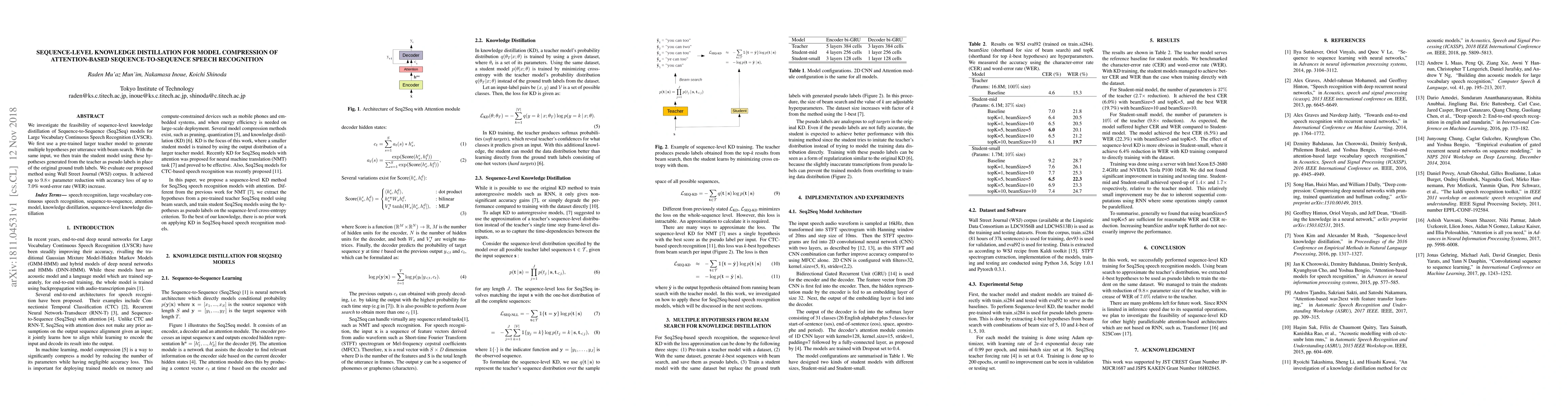 This paper explores sequence-level knowledge distillation to compress large attention-based Seq2Seq models for LVCSR, achieving up to 9.8× parameter reduction with a 7.0% WER increase using the WSJ corpus. The student model is trained with hypotheses from a pre-trained teacher model as pseudo labels.