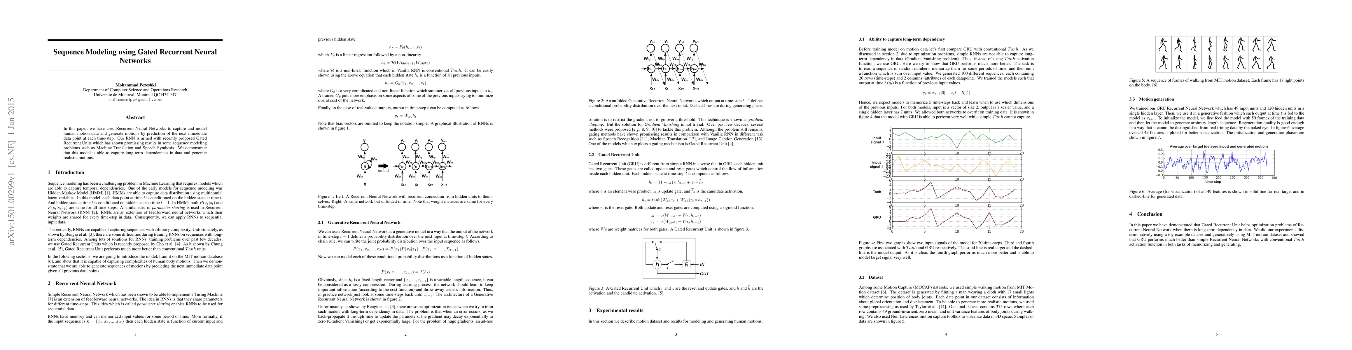 This paper employs Gated Recurrent Units (GRUs) within Recurrent Neural Networks (RNNs) to model and predict human motion data, successfully capturing long-term dependencies and generating realistic future motions. The GRU-enhanced RNNs show promising results in sequence modeling tasks.