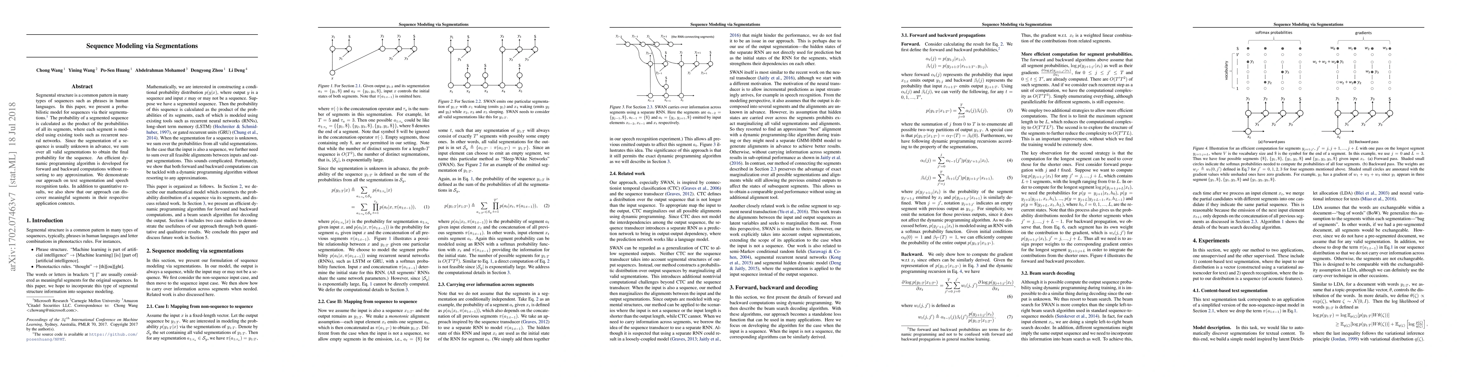 Segmental structure is a common pattern in many types of sequences such as phrases in human languages. In this paper, we present a probabilistic model for sequences via their segmentations. The probability of a segmented sequence is calculated as the product of the probabilities of all its segments, where each segment is modeled using existing tools such as recurrent neural networks. Since the segmentation of a sequence is usually unknown in advance, we sum over all valid segmentations to obtain the final probability for the sequence. An efficient dynamic programming algorithm is developed for forward and backward computations without resorting to any approximation. We demonstrate our approach on text segmentation and speech recognition tasks. In addition to quantitative results, we also show that our approach can discover meaningful segments in their respective application contexts.