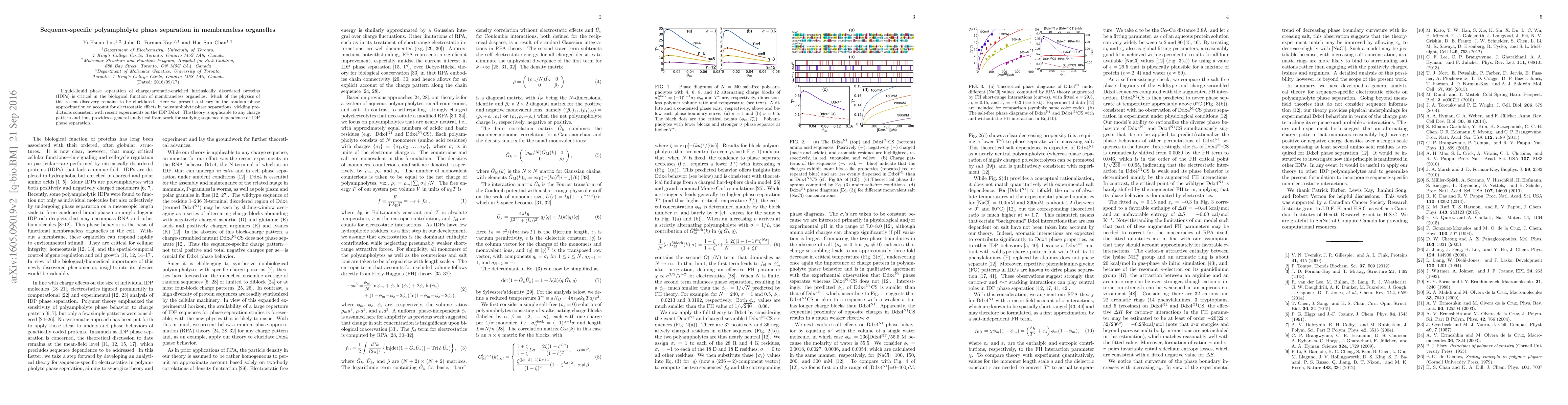 Liquid-liquid phase separation of charge/aromatic-enriched intrinsically disordered proteins (IDPs) is critical in the biological function of membraneless organelles. Much of the physics of this recent discovery remains to be elucidated. Here we present a theory in the random phase approximation to account for electrostatic effects in polyampholyte phase separations, yielding predictions consistent with recent experiments on the IDP Ddx4. The theory is applicable to any charge pattern and thus provides a general analytical framework for studying sequence dependence of IDP phase separation.