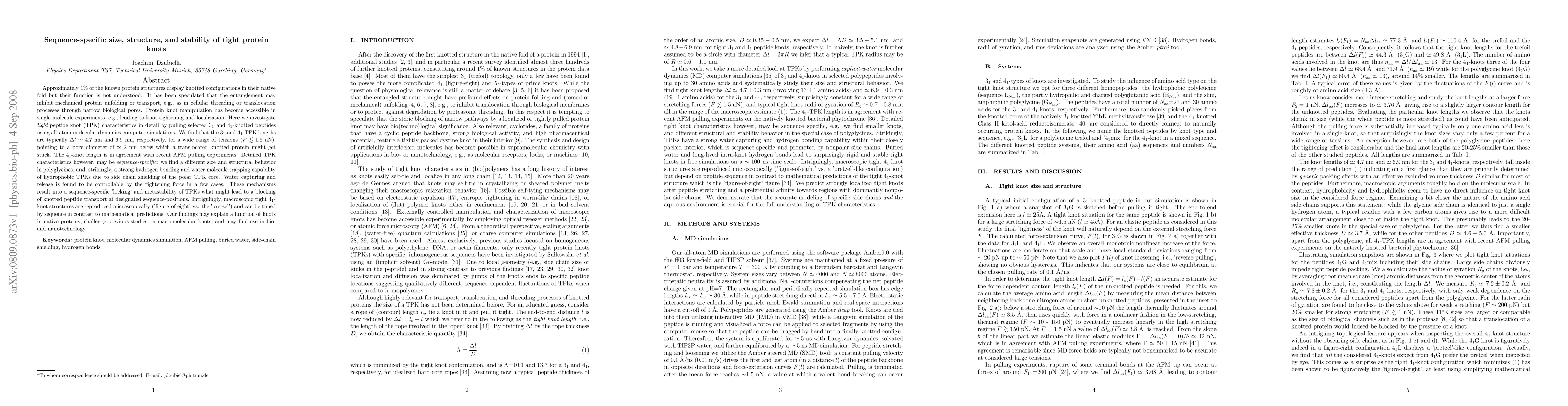 Approximately 1% of the known protein structures display knotted configurations in their native fold but their function is not understood. It has been speculated that the entanglement may inhibit mechanical protein unfolding or transport, e.g., as in cellular threading or translocation processes through narrow biological pores. Here we investigate tigh peptide knot (TPK) characteristics in detail by pulling selected 3_1 and 4_1-knotted peptides using all-atom molecular dynamics computer simulations. We find that the 3_1 and 4_1-TPK lengths are typically Delta l~4.7 nm and 6.9 nm, respectively, for a wide range of tensions (F < 1.5 nN), pointing to a pore diameter of ~2 nm below which a translocated knotted protein might get stuck. The 4_1-knot length is in agreement with recent AFM pulling experiments. Detailed TPK characteristics however, may be sequence-specific: we find a different size and structural behavior in polyglycines, and, strikingly, a strong hydrogen bonding and water molecule trapping capability of hydrophobic TPKs due to side chain shielding of the polar TPK core. Water capturing and release is found to be controlla ble by the tightening force in a few cases. These mechanisms result into a sequence-specific 'locking' and metastability of TPKs what might lead to a blocking of knotted peptide transport at designated sequence-positions. Intriguingly, macroscopic tight 4_1-knot structures are reproduced microscopically ('figure-of-eight' vs. the 'pretzel') and can be tuned by sequence in contrast to mathematical predictions. Our findings may explain a function of knots in native proteins, challenge previous studies on macromolecular knots, and may find use in bio- and nanotechnology.