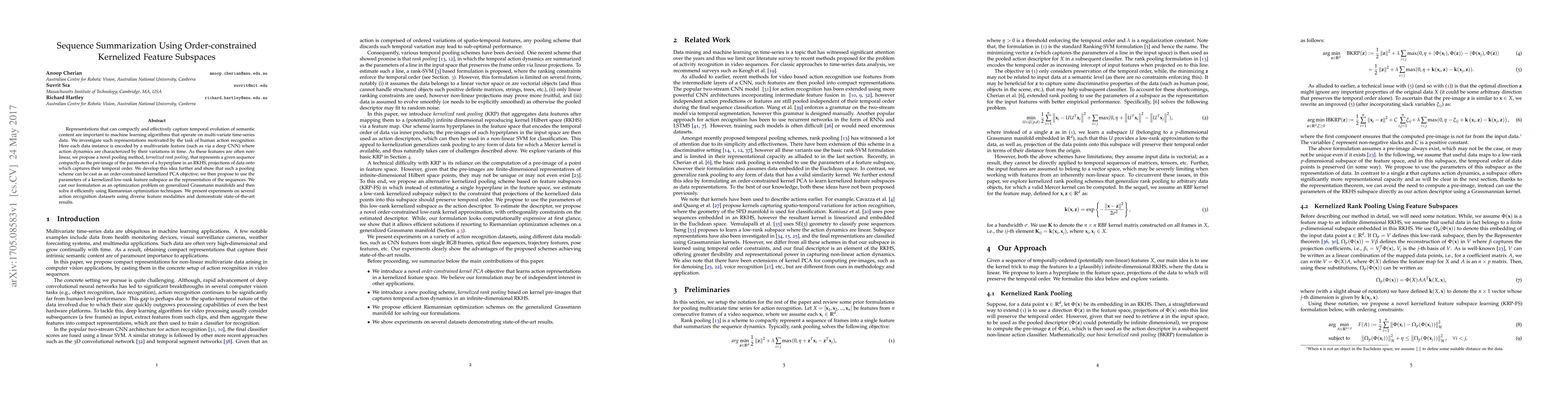 Representations that can compactly and effectively capture temporal evolution of semantic content are important to machine learning algorithms that operate on multi-variate time-series data. We investigate such representations motivated by the task of human action recognition. Here each data instance is encoded by a multivariate feature (such as via a deep CNN) where action dynamics are characterized by their variations in time. As these features are often non-linear, we propose a novel pooling method, kernelized rank pooling, that represents a given sequence compactly as the pre-image of the parameters of a hyperplane in an RKHS, projections of data onto which captures their temporal order. We develop this idea further and show that such a pooling scheme can be cast as an order-constrained kernelized PCA objective; we then propose to use the parameters of a kernelized low-rank feature subspace as the representation of the sequences. We cast our formulation as an optimization problem on generalized Grassmann manifolds and then solve it efficiently using Riemannian optimization techniques. We present experiments on several action recognition datasets using diverse feature modalities and demonstrate state-of-the-art results.