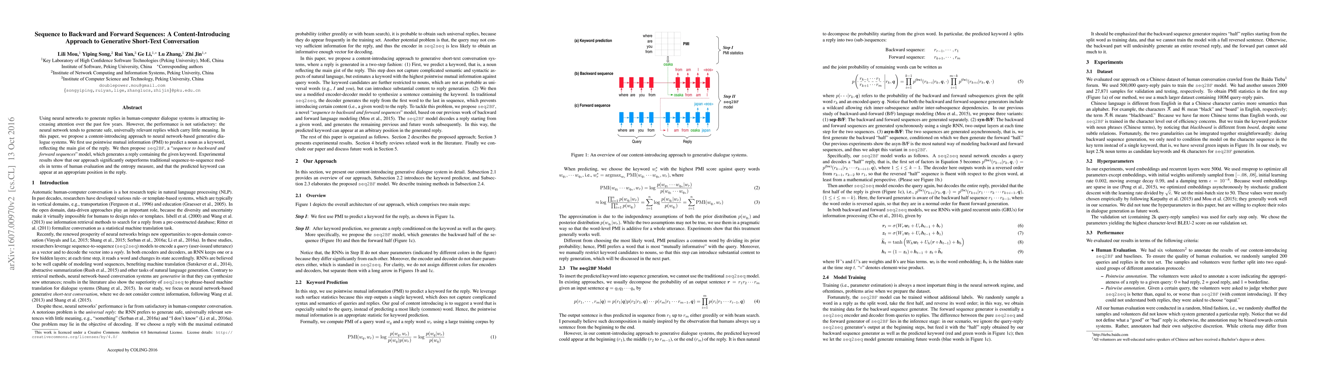 Using neural networks to generate replies in human-computer dialogue systems is attracting increasing attention over the past few years. However, the performance is not satisfactory: the neural network tends to generate safe, universally relevant replies which carry little meaning. In this paper, we propose a content-introducing approach to neural network-based generative dialogue systems. We first use pointwise mutual information (PMI) to predict a noun as a keyword, reflecting the main gist of the reply. We then propose seq2BF, a "sequence to backward and forward sequences" model, which generates a reply containing the given keyword. Experimental results show that our approach significantly outperforms traditional sequence-to-sequence models in terms of human evaluation and the entropy measure, and that the predicted keyword can appear at an appropriate position in the reply.