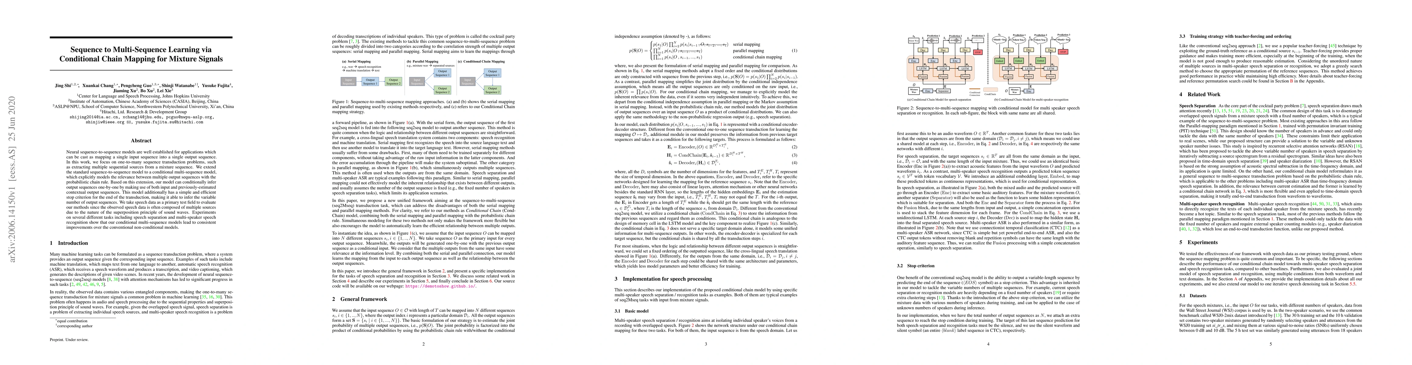 This paper proposes a conditional multi-sequence model that extends sequence-to-sequence models to handle one-to-many transduction problems, like separating multiple speech sources. The model uses probabilistic chain rule to model relevance between outputs, infers sequences contextually, and has an efficient stop criterion for variable output lengths. Experiments on speech separation and multi-speaker recognition tasks demonstrate consistent improvements over conventional models.