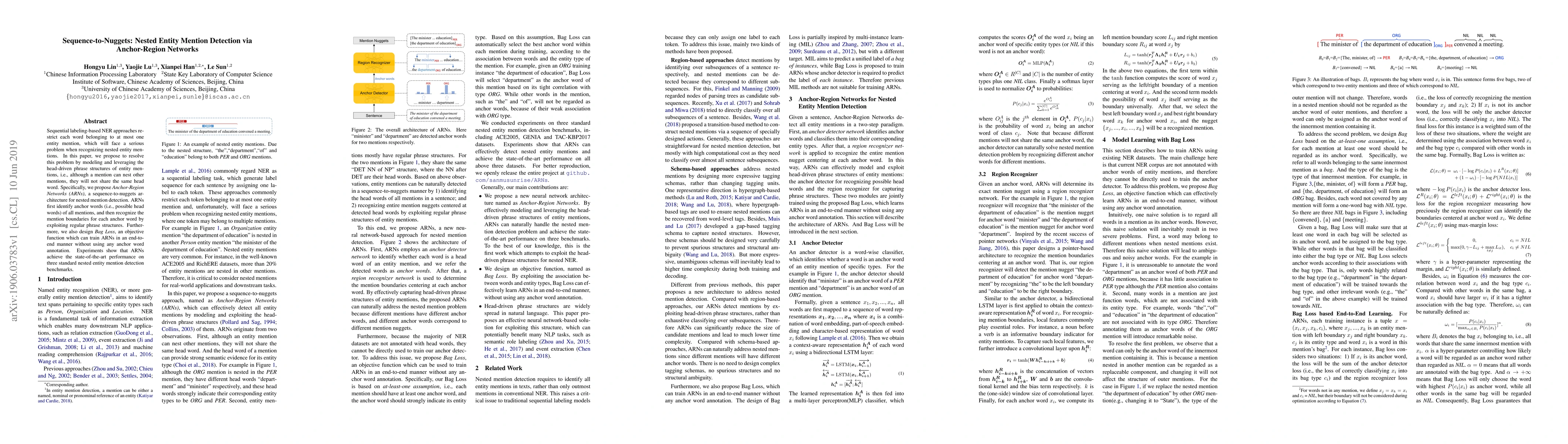 This paper proposes Anchor-Region Networks (ARNs) to detect nested entity mentions by identifying anchor words and leveraging phrase structures, achieving state-of-the-art performance on standard benchmarks. The method uses Bag Loss for end-to-end training without requiring anchor word annotations.