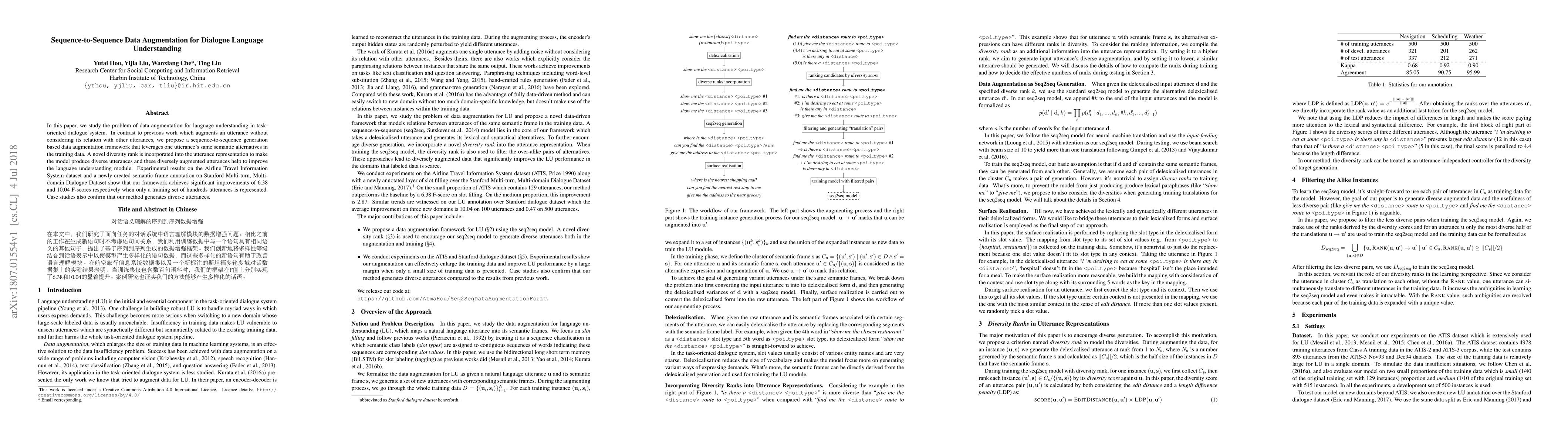 This paper proposes a sequence-to-sequence data augmentation framework for improving dialogue language understanding in task-oriented systems by generating diverse semantic alternatives of utterances. Experimental results show significant F-score improvements on two datasets, demonstrating the effectiveness of the method.