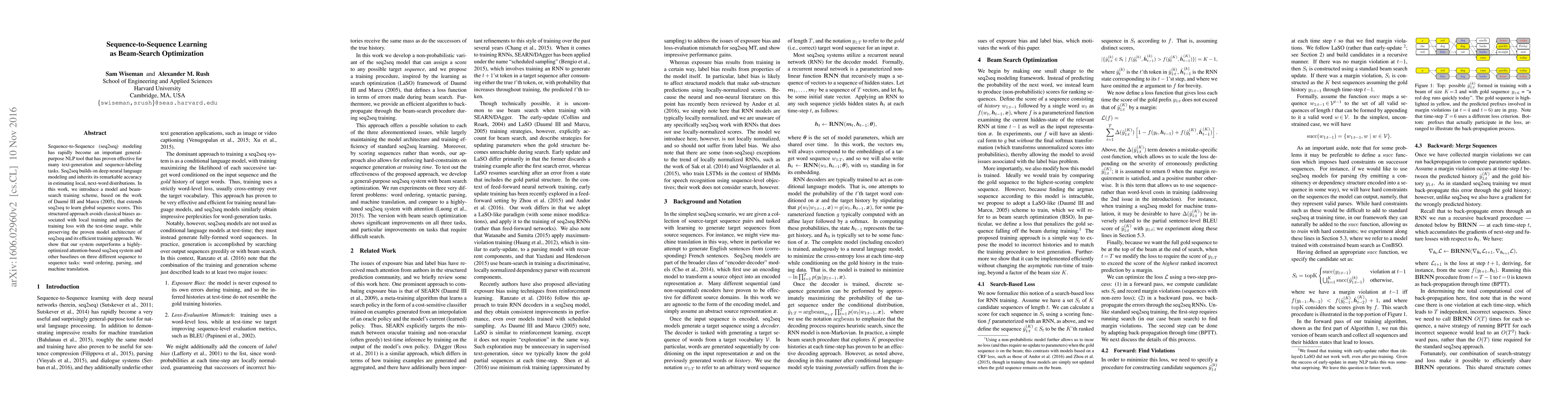 Researchers introduce a model that extends sequence-to-sequence learning to learn global sequence scores through beam-search optimization, outperforming traditional attention-based models on word ordering, parsing, and machine translation tasks.