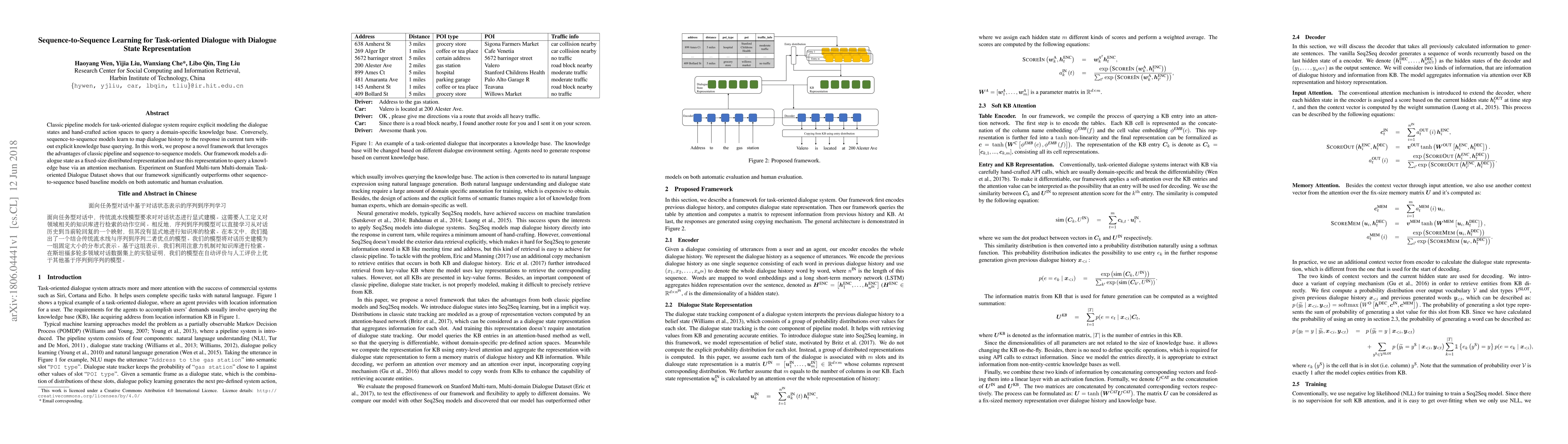 This research proposes a hybrid framework that combines the strengths of classic pipeline models and sequence-to-sequence models for task-oriented dialogue systems, achieving superior performance on dialogue state representation and response generation through a knowledge base querying mechanism using a distributed dialogue state representation. The proposed method outperforms sequence-to-sequence baselines on both automatic and human evaluations.