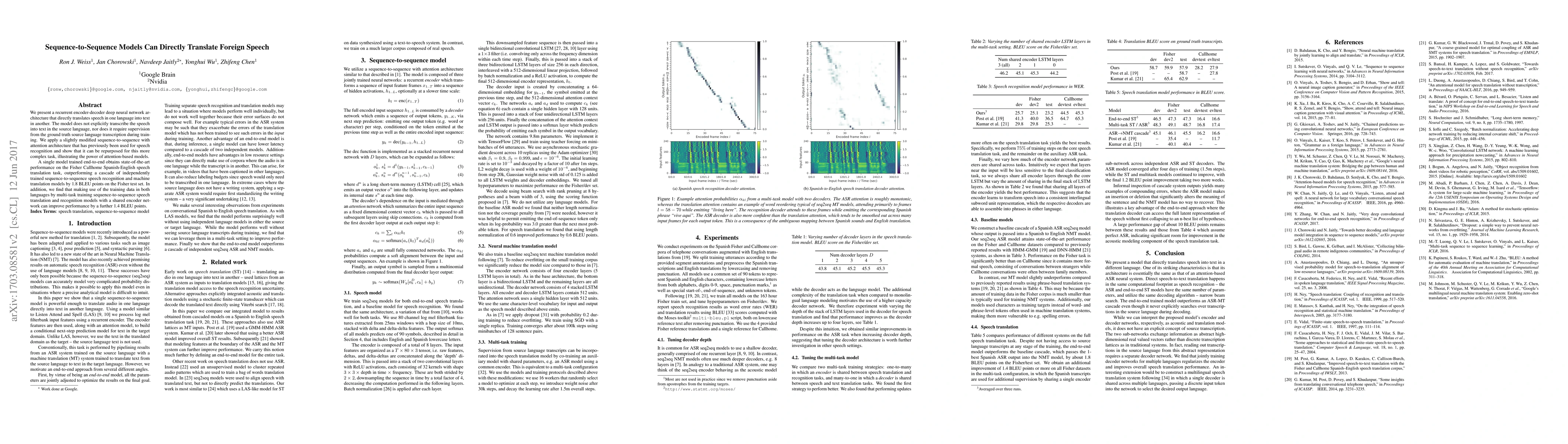 We present a recurrent encoder-decoder deep neural network architecture that directly translates speech in one language into text in another. The model does not explicitly transcribe the speech into text in the source language, nor does it require supervision from the ground truth source language transcription during training. We apply a slightly modified sequence-to-sequence with attention architecture that has previously been used for speech recognition and show that it can be repurposed for this more complex task, illustrating the power of attention-based models. A single model trained end-to-end obtains state-of-the-art performance on the Fisher Callhome Spanish-English speech translation task, outperforming a cascade of independently trained sequence-to-sequence speech recognition and machine translation models by 1.8 BLEU points on the Fisher test set. In addition, we find that making use of the training data in both languages by multi-task training sequence-to-sequence speech translation and recognition models with a shared encoder network can improve performance by a further 1.4 BLEU points.