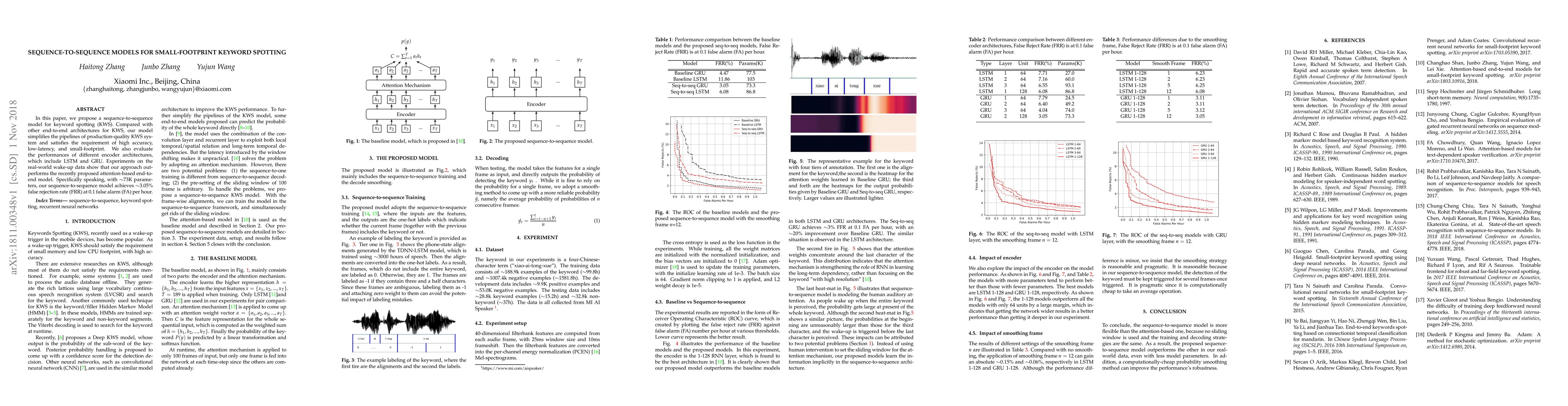 This paper proposes a sequence-to-sequence model for efficient keyword spotting, achieving high accuracy and low-latency with a small footprint. Experiments demonstrate superior performance compared to attention-based models, with a false rejection rate of $\sim$3.05% at 0.1 false alarm per hour using only 73K parameters.