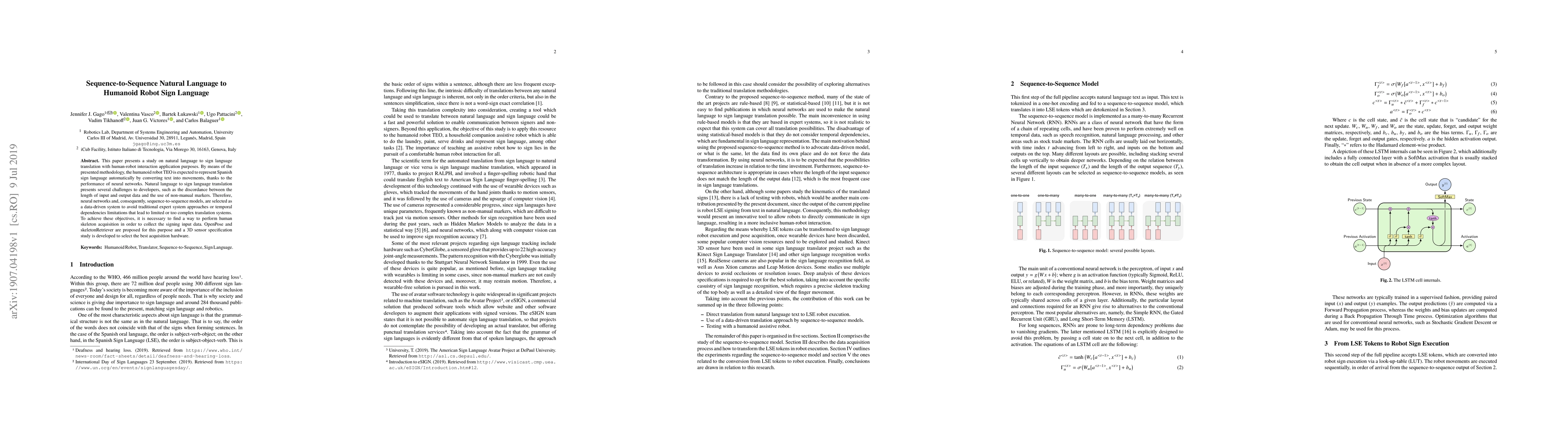 This paper develops a neural network-based sequence-to-sequence model for translating Spanish natural language into sign language for a humanoid robot, addressing challenges like data length discordance and non-manual markers. OpenPose and skeletonRetriever are used for human skeleton acquisition, and a 3D sensor is selected for optimal data collection.