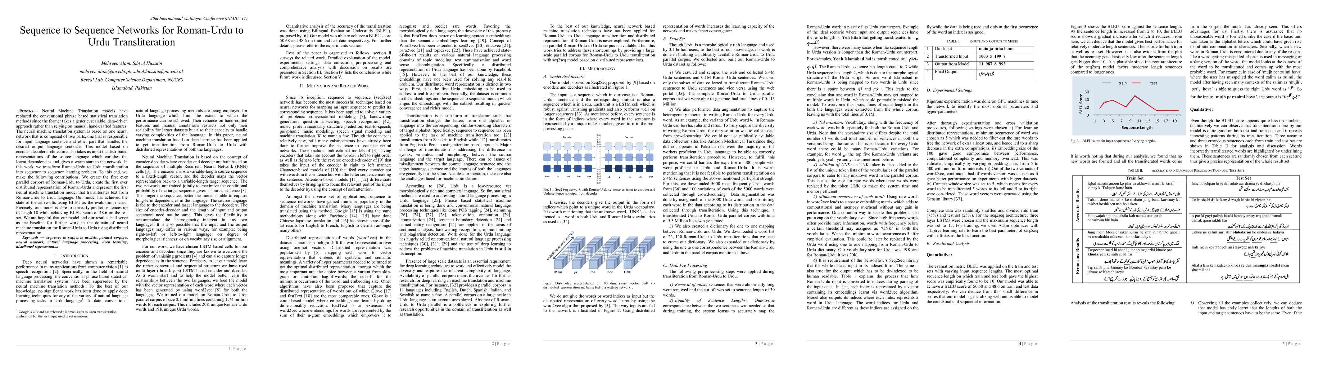 The paper presents the first neural machine translation model for Roman-Urdu to Urdu transliteration, utilizing distributed word representations and a seq2seq architecture.