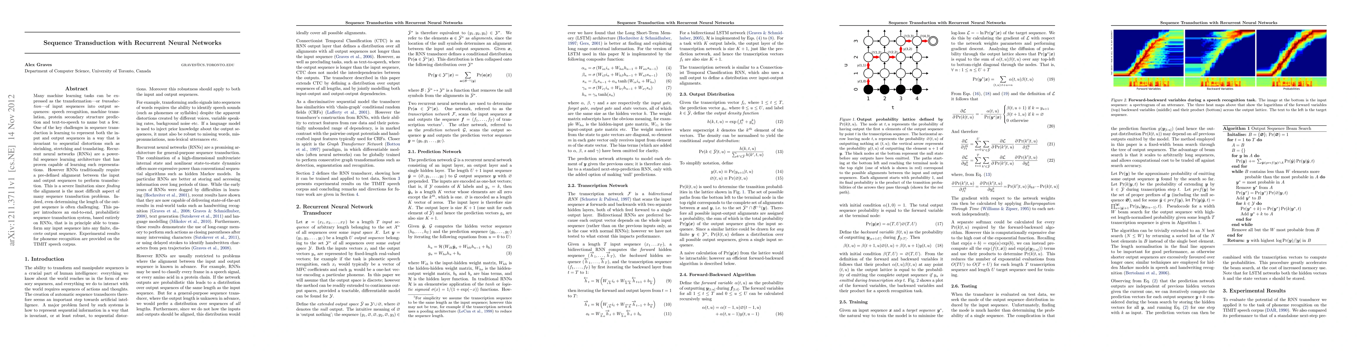 This paper proposes an end-to-end, probabilistic sequence transduction system based on recurrent neural networks (RNNs) that can transform input sequences into any finite, discrete output sequences without requiring a pre-defined alignment. Experimental results on phoneme recognition using the TIMIT speech corpus demonstrate its effectiveness.