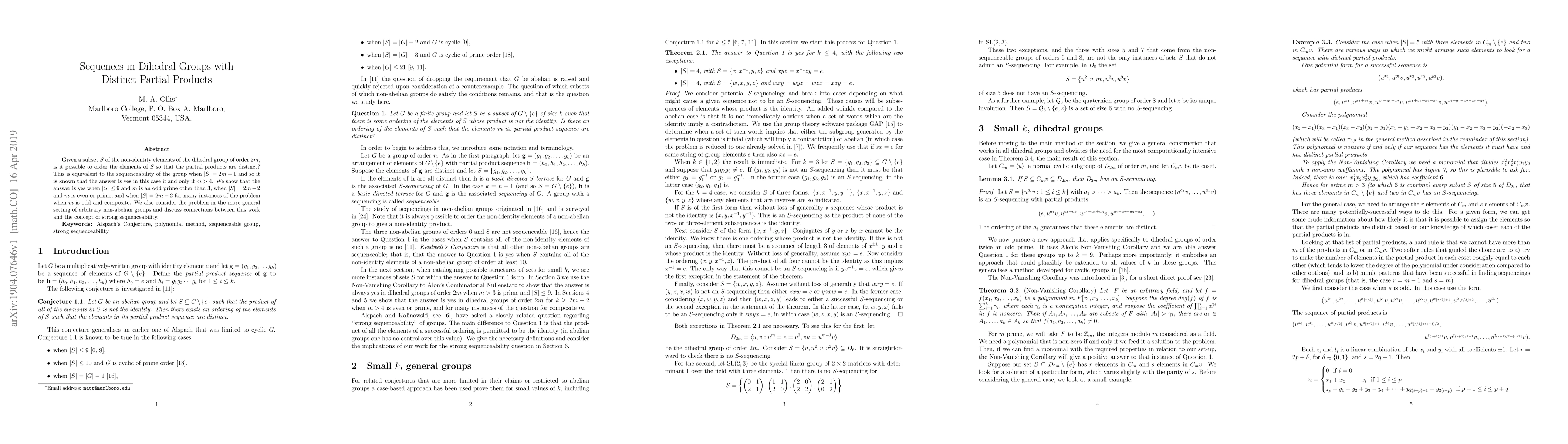 Researchers investigated whether elements in a dihedral group can be ordered for distinct partial products, finding solutions under specific conditions with limited element counts or prime/multiple of 2 properties.