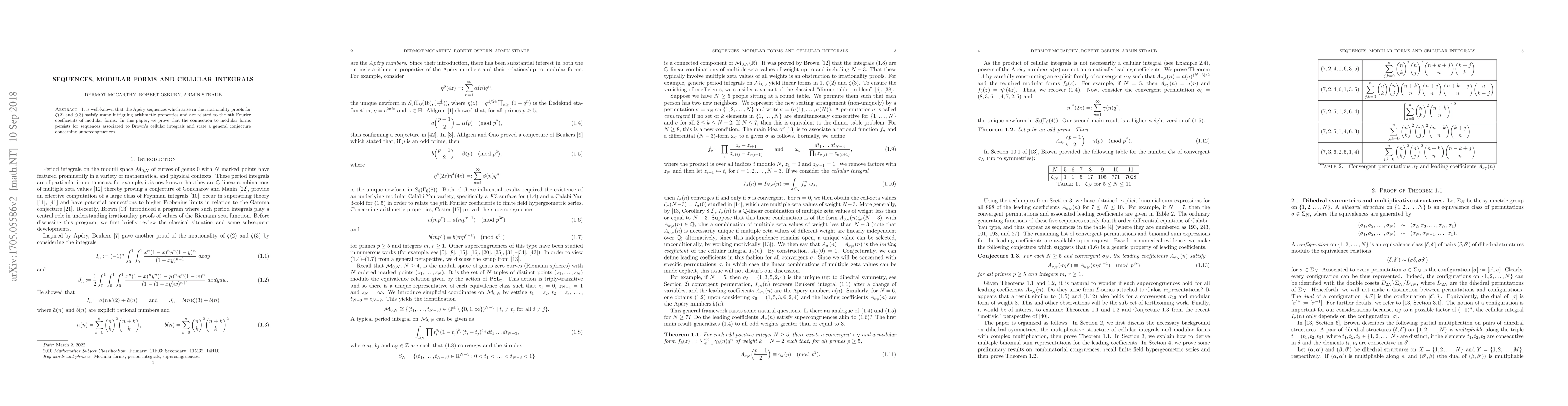 It is well-known that the Ap\'ery sequences which arise in the irrationality proofs for $\zeta(2)$ and $\zeta(3)$ satisfy many intriguing arithmetic properties and are related to the $p$th Fourier coefficients of modular forms. In this paper, we prove that the connection to modular forms persists for sequences associated to Brown's cellular integrals and state a general conjecture concerning supercongruences.