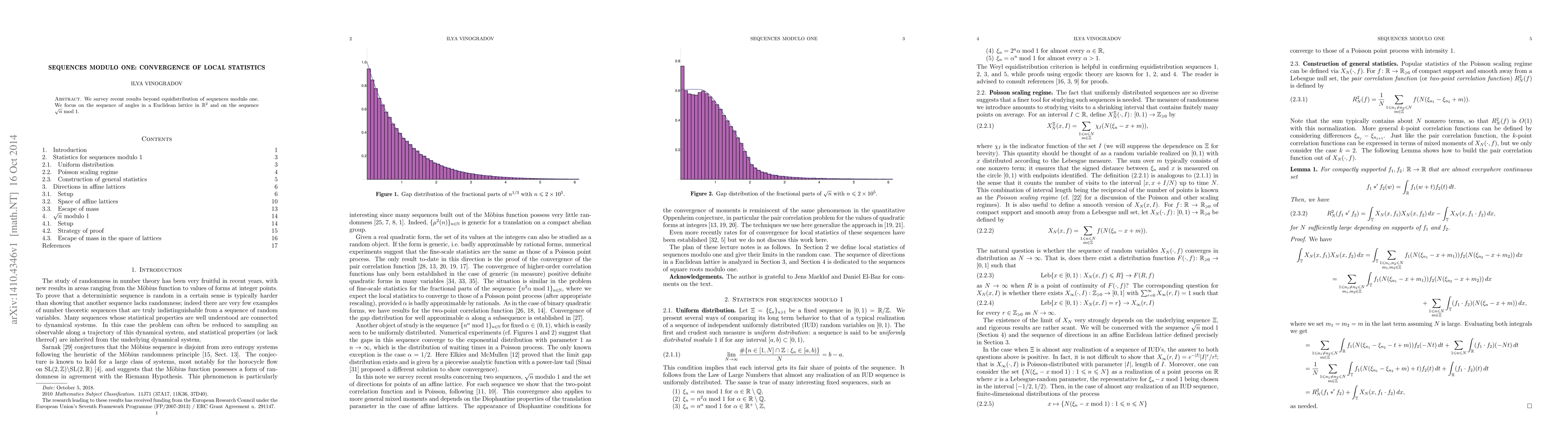 We survey recent results beyond equidistribution of sequences modulo one. We focus on the sequence of angles in a Euclidean lattice in $\mathbb R^2$ and on the sequence $\sqrt n\bmod1 $.