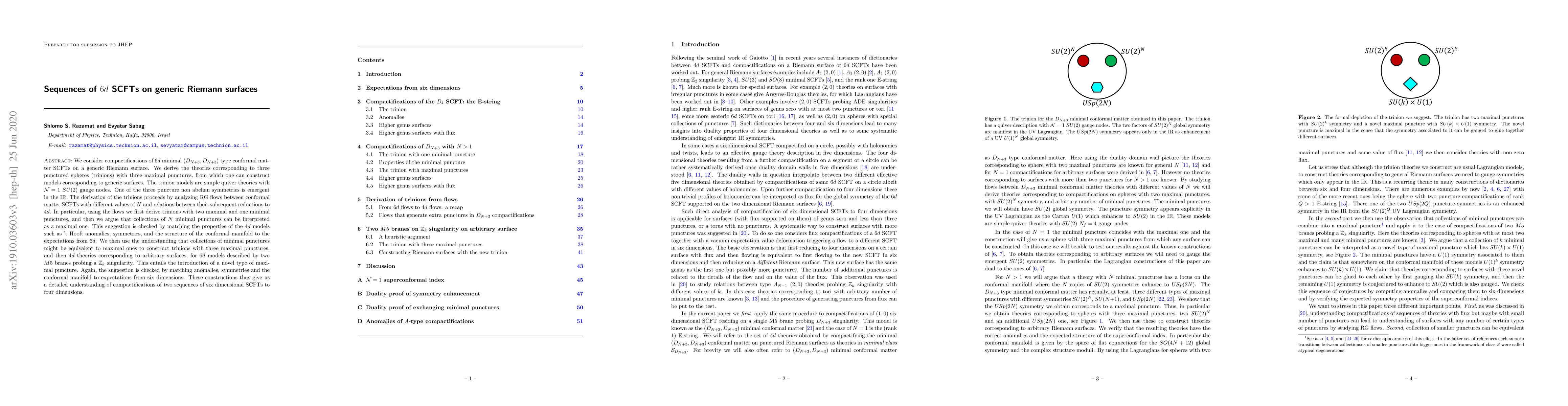 This paper explores the compactification of $6d$ minimal $(D_{N+3},D_{N+3})$ SCFTs on generic Riemann surfaces, deriving theories for trinions with three maximal punctures. It constructs these models via RG flows and checks their equivalence by matching properties like `t Hooft anomalies and symmetries, providing insights into the compactification of two sequences of $6d$ SCFTs to $4d$.