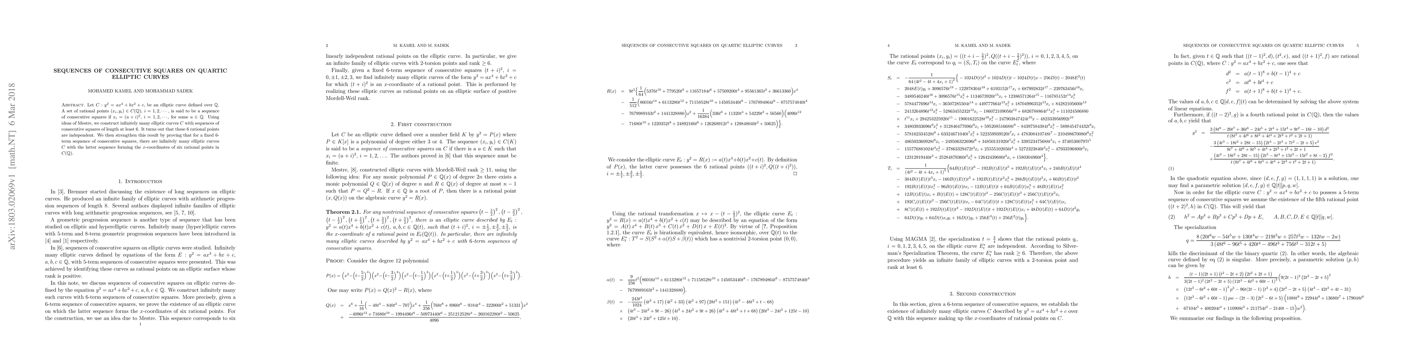 Let $C: y^2=ax^4+bx^2+c$, be an elliptic curve defined over $\mathbb Q$. A set of rational points $(x_i,y_i) \in C(\mathbb Q)$, $i=1,2,\cdots,$ is said to be a sequence of consecutive squares if $x_i= (u + i)^2$, $i=1,2,\cdots$, for some $u\in \mathbb Q$. Using ideas of Mestre, we construct infinitely many elliptic curves $C$ with sequences of consecutive squares of length at least $6$. It turns out that these 6 rational points are independent. We then strengthen this result by proving that for a fixed $6$-term sequence of consecutive squares, there are infinitely many elliptic curves $C$ with the latter sequence forming the $x$-coordinates of six rational points in $C(\mathbb Q)$.