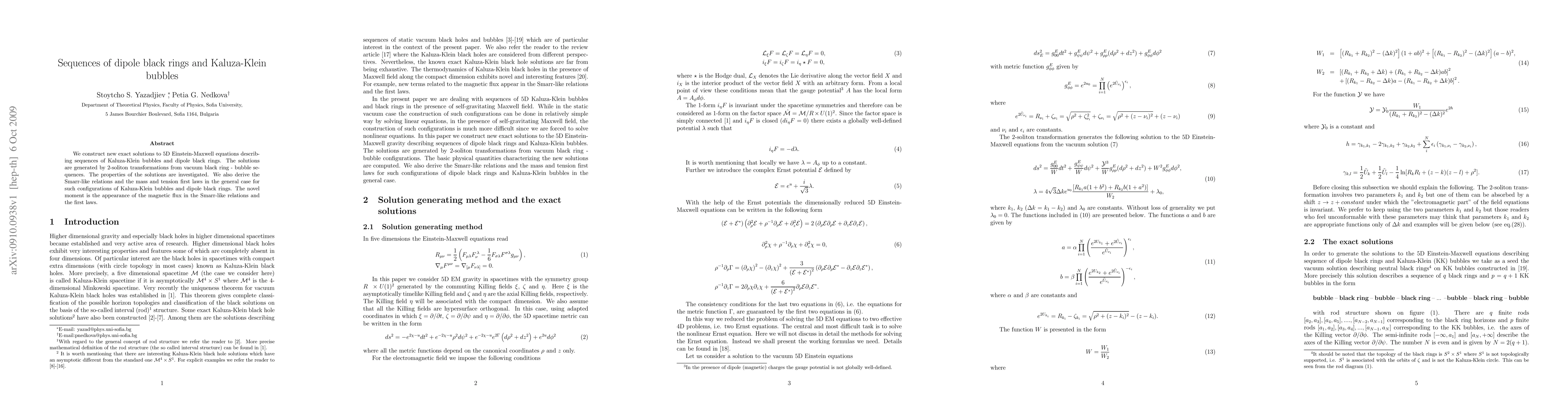 This paper presents new exact solutions to 5D Einstein-Maxwell equations for sequences of Kaluza-Klein bubbles and dipole black rings, derived through 2-soliton transformations. It investigates their properties and introduces Smarr-like relations and mass and tension first laws, highlighting the novel presence of magnetic flux in these relations.