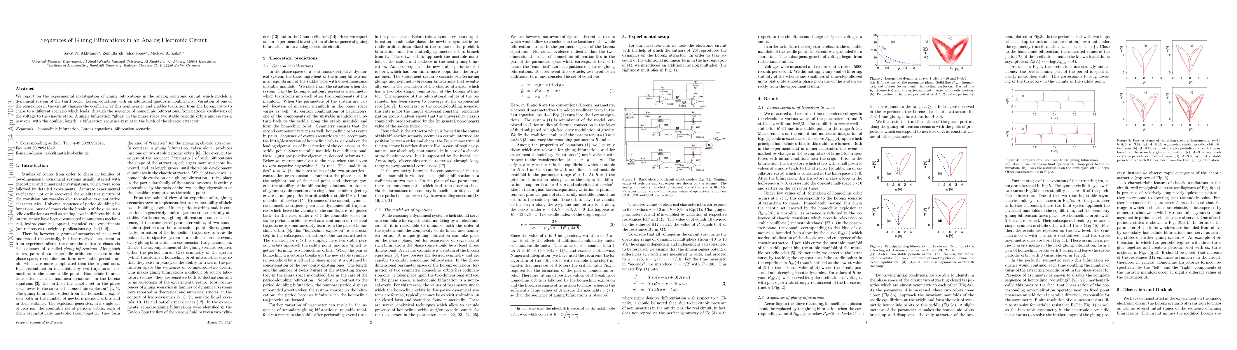 This paper investigates gluing bifurcations in an analog electronic circuit modeling the Lorenz equations with an added quadratic nonlinearity. By varying resistance, the circuit transitions from periodic oscillations to chaos through a sequence of homoclinic bifurcations, ultimately forming a chaotic attractor.