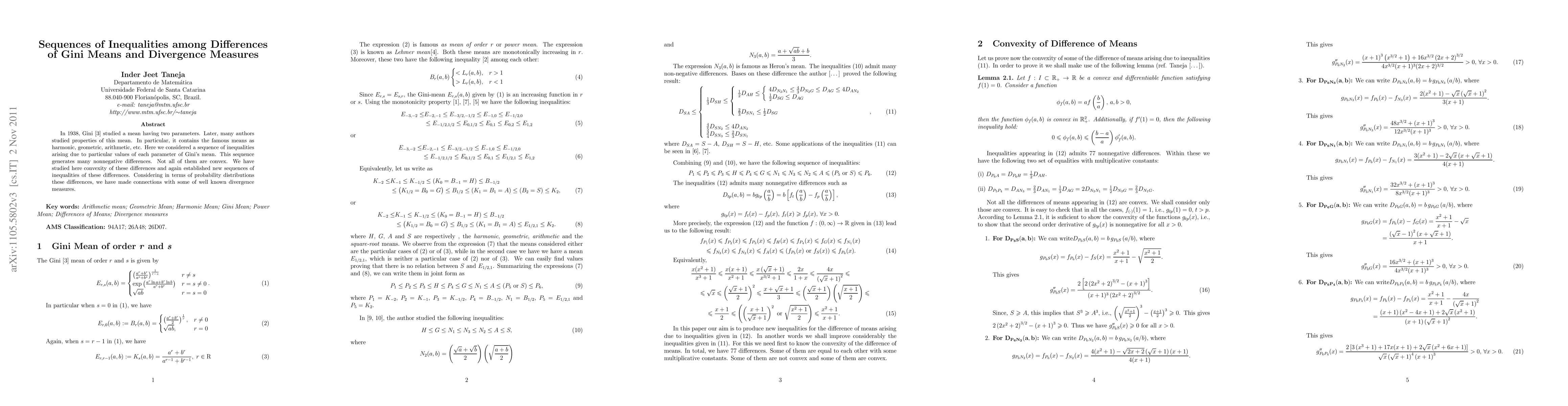 In 1938, Gini studied a mean having two parameters. Later, many authors studied properties of this mean. In particular, it contains the famous means as harmonic, geometric, arithmetic, etc. Here we considered a sequence of inequalities arising due to particular values of each parameter of Gini's mean. This sequence generates many nonnegative differences. Not all of them are convex. We have studied here convexity of these differences and again established new sequences of inequalities of these differences. Considering in terms of probability distributions these differences, we have made connections with some of well known divergence measures.