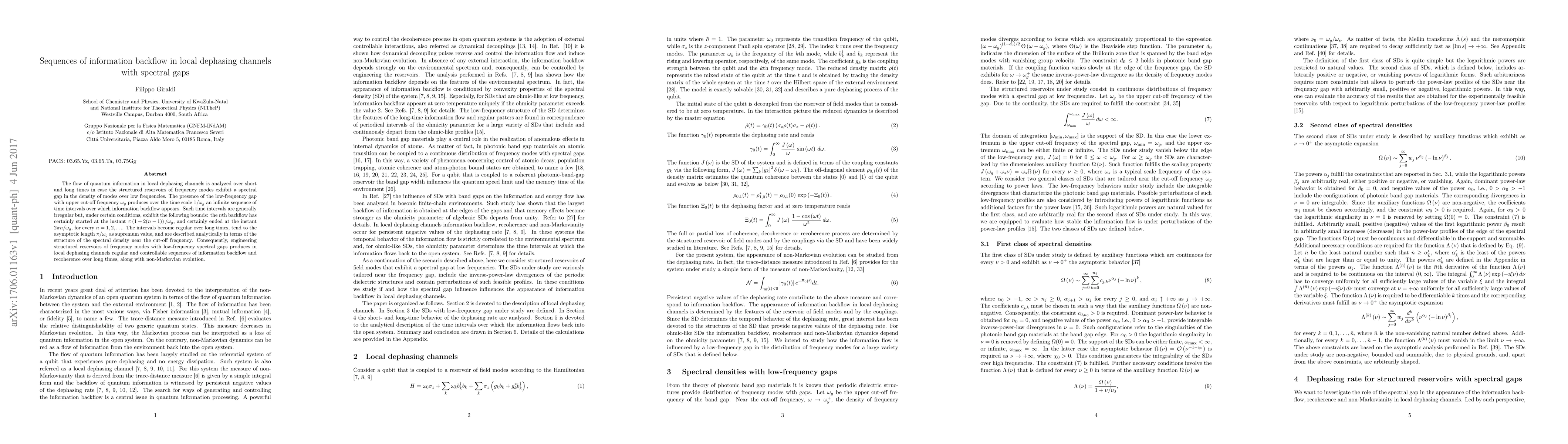 This paper investigates the quantum information flow in local dephasing channels with spectral gaps, revealing that low-frequency gaps induce periodic sequences of information backflow over time. The study shows that these sequences become regular and analytically predictable over long times, offering potential for engineering controlled recoherence in quantum systems.