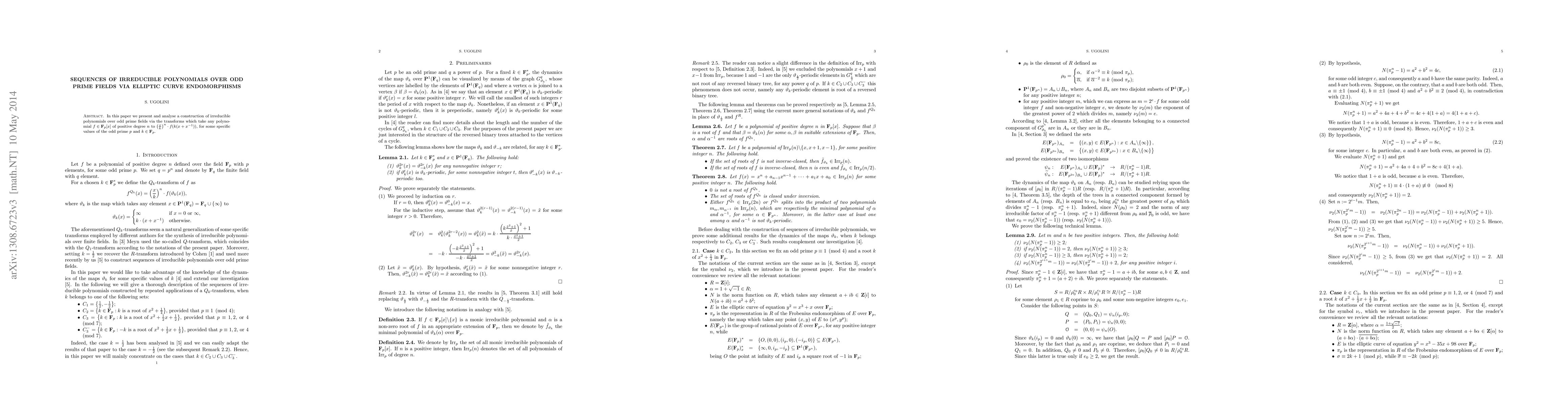 Summary: This paper constructs sequences of irreducible polynomials over odd prime fields by transforming polynomials using elliptic curve endomorphisms, specifically applying the transform $\left(\frac{x}{k} \right)^n \cdot f(k(x+x^{-1}))$ for suitable primes and $k$. The construction's properties and effectiveness are analyzed.