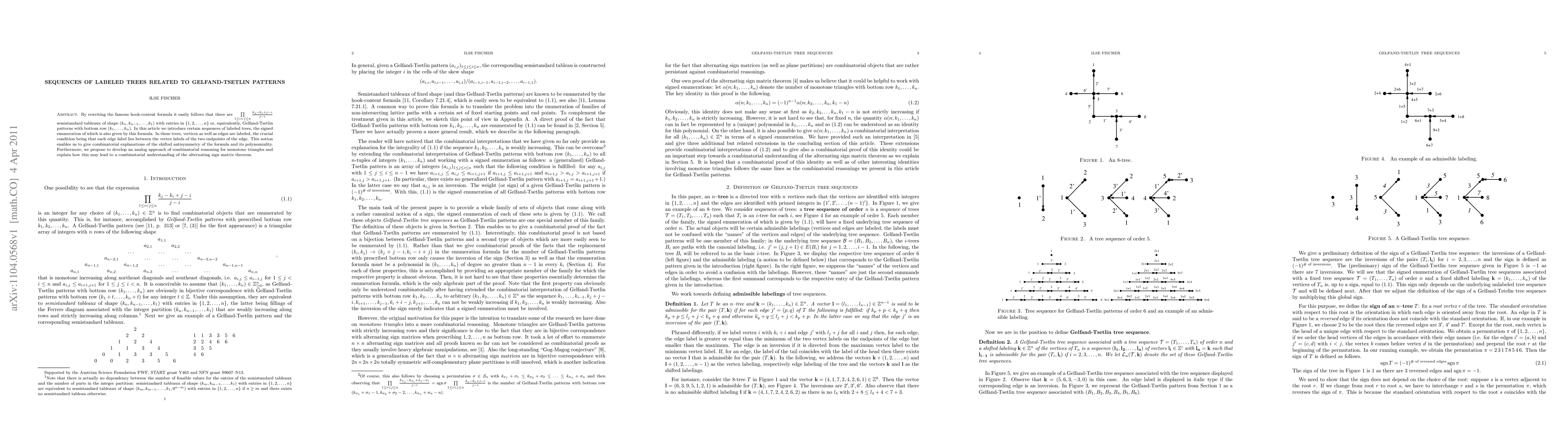 By rewriting the famous hook-content formula it easily follows that there are $\prod\limits_{1 \le i < j \le n} \frac{k_j - k_i + j -i}{j-i}$ semistandard tableaux of shape $(k_n,k_{n-1},...,k_1)$ with entries in $\{1,2,...,n\}$ or, equivalently, Gelfand-Tsetlin patterns with bottom row $(k_1,...,k_n)$. In this article we introduce certain sequences of labeled trees, the signed enumeration of which is also given by this formula. In these trees, vertices as well as edges are labeled, the crucial condition being that each edge label lies between the vertex labels of the two endpoints of the edge. This notion enables us to give combinatorial explanations of the shifted antisymmetry of the formula and its polynomiality. Furthermore, we propose to develop an analog approach of combinatorial reasoning for monotone triangles and explain how this may lead to a combinatorial understanding of the alternating sign matrix theorem.