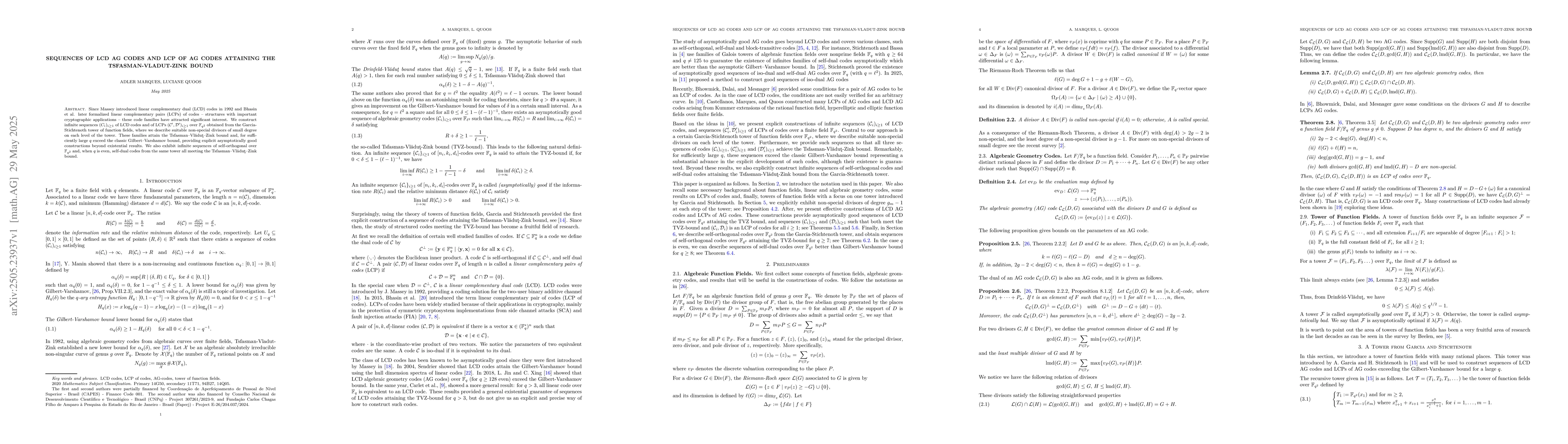The research constructs infinite sequences of LCD codes and LCPs over F_q^2 using non-special divisors of small degree on each level of the Garcia-Stichtenoth tower of function fields.