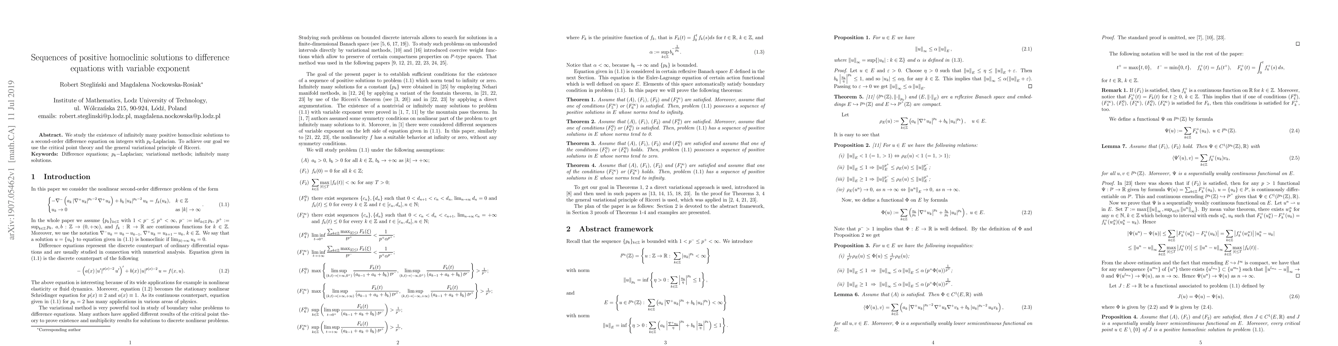 Summary: The paper investigates the existence of infinitely many positive homoclinic solutions for a second-order difference equation featuring a $p_k$-Laplacian, utilizing critical point theory and Ricceri's variational principle.