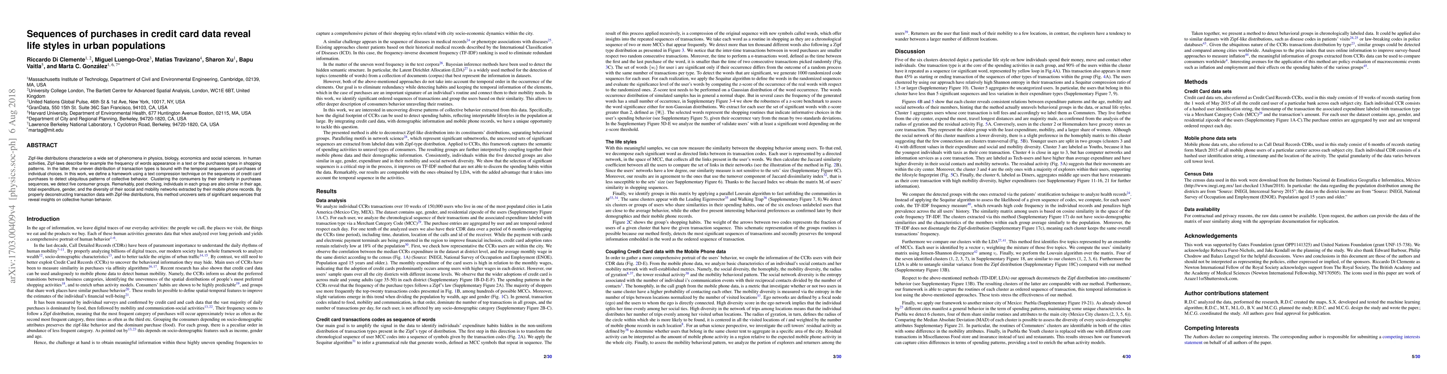 Zipf-like distributions characterize a wide set of phenomena in physics, biology, economics and social sciences. In human activities, Zipf-laws describe for example the frequency of words appearance in a text or the purchases types in shopping patterns. In the latter, the uneven distribution of transaction types is bound with the temporal sequences of purchases of individual choices. In this work, we define a framework using a text compression technique on the sequences of credit card purchases to detect ubiquitous patterns of collective behavior. Clustering the consumers by their similarity in purchases sequences, we detect five consumer groups. Remarkably, post checking, individuals in each group are also similar in their age, total expenditure, gender, and the diversity of their social and mobility networks extracted by their mobile phone records. By properly deconstructing transaction data with Zipf-like distributions, this method uncovers sets of significant sequences that reveal insights on collective human behavior.