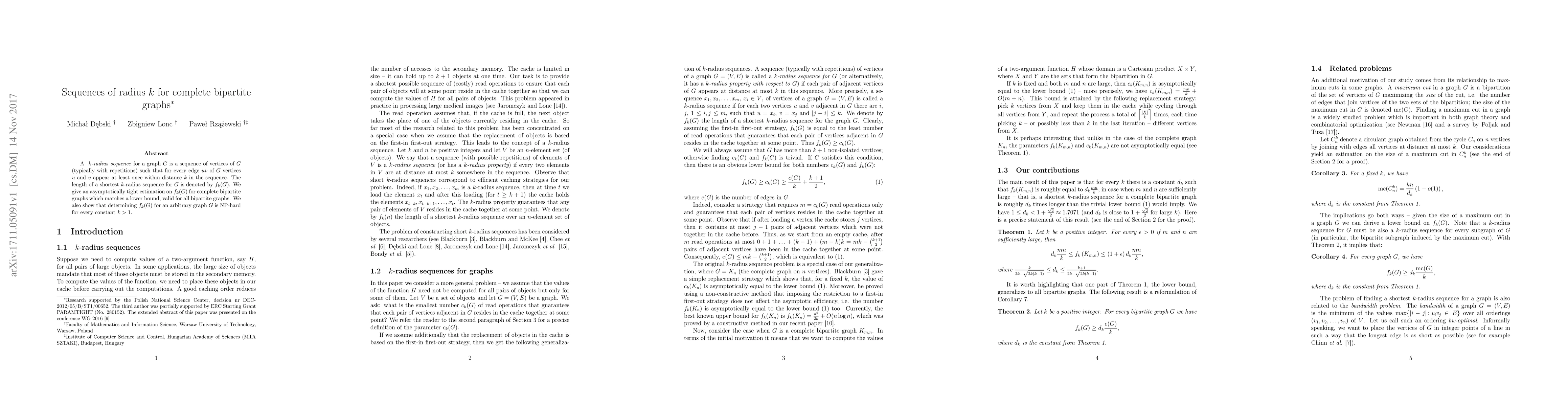 This paper estimates a tight lower bound for the length of shortest k-radius sequences in complete bipartite graphs, while proving NP-hardness for arbitrary graphs.